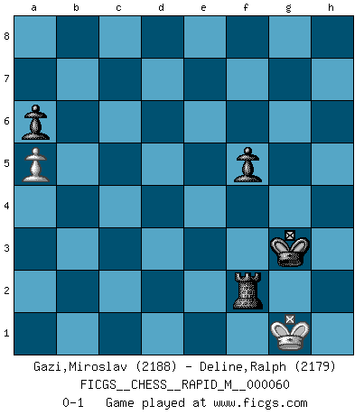 Last move : 0-1 2013 May 2 19:34:17 [Event "FICGS__CHESS__RAPID_M__000060"] [Site "FICGS"] [Date "2012.11.29"] [Round "1"] [White "Gazi,Miroslav"] [Black "Deline,Ralph"] [Result "0-1"] [WhiteElo "2188"] [BlackElo "2179"] 1.d4 Nf6 2.Bg5 d5 3.Nd2 c5 4.dxc5 e6 5.Nb3 Nbd7 6.e3 Nxc5 7.Nxc5 Bxc5 8.Bb5+ Kf8 9.Bd3 e5 10.c3 Be6 11.Ne2 h6 12.Bh4 g6 13.O-O Kg7 14.b4 Bb6 15.a4 a6 16.Qd2 Qe7 17.f4 exf4 18.Nd4 Rae8 19.exf4 Ne4 20.Bxe4 Qxh4 21.Bf3 Qf6 22.a5 Ba7 23.Rae1 Bd7 24.Kh1 Ba4 25.g3 Rc8 26.Re5 Bxd4 27.cxd4 Rc2 28.Qe3 Rhc8 29.Bxd5 R8c3 30.Qe4 Bb5 31.Re1 Bd3 32.Qe3 Be2 33.Qg1 Qd6 34.Bxb7 Qxb4 35.Bg2 Bf3 36.Bxf3 Rxf3 37.R1e2 Qc4 38.Rxc2 Qxc2 39.d5 Rf2 40.g4 Qa2 41.Re4 Kh7 42.h4 Rb2 43.d6 Qb3 44.Qf1 Qc2 45.Qe2 Qxe2 46.Rxe2 Rxe2 47.h5 Rd2 48.hxg6+ Kxg6 49.d7 Rxd7 50.Kg2 f5 51.Kh3 Rd3+ 52.Kh4 Ra3 53.g5 hxg5+ 54.fxg5 Ra4+ 55.Kg3 Kxg5 56.Kf3 Re4 57.Kg3 Rf4 58.Kg2 Kg4 59.Kh2 Rf2+ 60.Kg1 Kg3 0-1 Trompowsky attack (Ruth, Opovcensky Opening) Kingside Castling by player White (move 13) 10 pieces endgame at move 48 : White KPPPP , Black KRPPP WHITE : King + 4 Pawns BLACK : King + 1 Rook 3 Pawns 9 pieces endgame at move 49 : White KPPP , Black KRPPP WHITE : King + 3 Pawns BLACK : King + 1 Rook 3 Pawns 8 pieces endgame at move 53 : White KPP , Black KRPPP WHITE : King + 2 Pawns BLACK : King + 1 Rook 3 Pawns 7 pieces endgame at move 54 : White KPP , Black KRPP WHITE : King + 2 Pawns BLACK : King + 1 Rook 2 Pawns 6 pieces endgame at move 55 : White KP , Black KRPP WHITE : King + 1 Pawn BLACK : King + 1 Rook 2 Pawns Player Black won this chess game. Follow this game move after move (download)Best by test: 1. e4 (Bobby Fischer) Was ist der Unterschied zwischen einem Strassenarbeiter und einem Schachspieler? --Der Schachspieler bewegt sich ab und zu. (Anonymous) Todo se encuentra en un estado de flujo y esto incluye al mundo del Ajedrez. (Mikhail Botvinnik) Un journaliste : 'Vous préférez avoir une dame de plus sur l'échiquier ou au lit ?' Boris Spassky : 'Ca dépend de la position.' Panic is a sudden desertion of us, an a going over to the enemy of our imagination. (Christian Nevell Bovee)