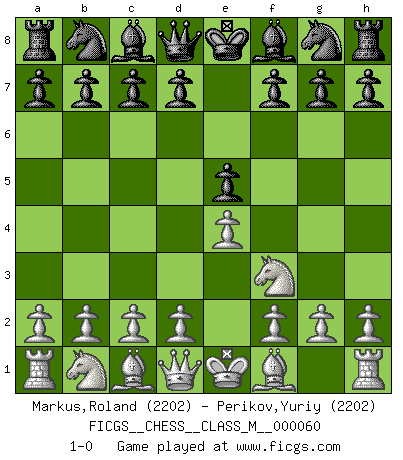 Last move : 1-0 2012 December 16 16:5:1 [Event "FICGS__CHESS__CLASS_M__000060"] [Site "FICGS"] [Date "2012.12.01"] [Round "1"] [White "Markus,Roland"] [Black "Perikov,Yuriy"] [Result "1-0"] [WhiteElo "2202"] [BlackElo "2202"] 1.e4 e5 2.Nf3 1-0 King's knight Opening Player White won this chess game. Follow this game move after move (download)We don't really know how the game was invented, though there are suspicions. As soon as we discover the culprits, we'll let you know. (Bruce Pandolfini) Ich verstehe mehr vom Schach als irgendein anderer lebender Meister. (José Raúl Capablanca) El Ajedrez demanda una total concentración. (Bobby Fischer) Botvinnik disait en comparant les échecs à la musique: Il existe une science dont le but est l'étude de l'acoustique et des sons. Mais il y a aussi un art qui se sert de l'océan des sons : c'est la musique. De toute évidence, il en est de même pour la pensée. La logique est l'étude des lois de la réflexion et les échecs reflètent, en tant qu'art, le côté logique de la réflexion, sous la forme d'images artistiques... Extrait de Fischer - Spassky, Reykjavik 1972 par Alexander & F. Wyndham (Ed. Solar), p 37. Somewhere in the world there is an epigram for every dilemma. (Hendrik Willem van Loon)