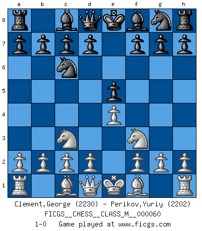 Last move : 1-0 2012 December 16 16:5:28 [Event "FICGS__CHESS__CLASS_M__000060"] [Site "FICGS"] [Date "2012.12.01"] [Round "1"] [White "Clement,George"] [Black "Perikov,Yuriy"] [Result "1-0"] [WhiteElo "2230"] [BlackElo "2202"] 1.e4 e5 2.Nf3 Nc6 3.Nc3 1-0 Three knights game Player White won this chess game. Follow this game move after move (download)I have never in my life played the French Defence, which is the dullest of all openings. (Wilhelm Steinitz) Das typische an einem Großmeister ist, daß er eine gewonnene Position schnell und schmerzlos gewinnt. (Irving Chernev) Alekhine es un poeta que crea un trabajo de arte de algo que raramente inspiraría a otra persona a mandar una tarjeta postal. (Max Euwe) Nous sommes les pions de la mystérieuse partie d'Echecs jouée par Dieu. Il nous déplace, nous arrête, nous pousse encore, puis nous lance un à un dans la boîte du Néant. Epitaphe sur la tombe de David Janowsky (1868-1927). I know the human being and fish can coexist peacefully. (George W. Bush, Saginaw sept. 29, 2000)