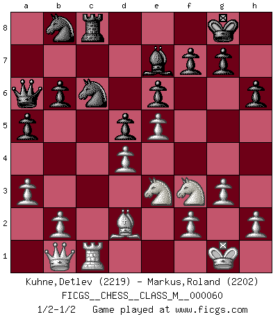 Last move : 1/2-1/2 2013 February 14 16:15:45 [Event "FICGS__CHESS__CLASS_M__000060"] [Site "FICGS"] [Date "2012.12.01"] [Round "1"] [White "Kuhne,Detlev"] [Black "Markus,Roland"] [Result "1/2-1/2"] [WhiteElo "2219"] [BlackElo "2202"] 1.Nf3 d5 2.d4 Nf6 3.c4 e6 4.g3 Be7 5.Bg2 O-O 6.O-O c6 7.Qc2 Nbd7 8.Nbd2 b6 9.e4 Bb7 10.e5 Ne8 11.cxd5 cxd5 12.Re1 Rc8 13.Qa4 Nc7 14.Bf1 a5 15.Bd3 Qe8 16.Qd1 Ba6 17.Nf1 h6 18.Be3 Bxd3 19.Qxd3 Nb8 20.Rac1 Qb5 21.Qb1 Nca6 22.Rxc8 Rxc8 23.Bd2 Nb4 24.a3 N4c6 25.Rc1 Qa6 26.Ne3 1/2-1/2 Reti Opening Kingside Castling by player Black (move 5) Kingside Castling by player White (move 6) This chess game ended in a draw. Follow this game move after move (download)I know people who have all the will in the world, but still can't play good Chess. (Bobby Fischer) In Buenos Aires ist es nicht mein vorrangiges Ziel ein starkes Turnier zu organisieren, sondern ein Turnier für Gentlemen. Ich würde nie Kamsky einladen. Ich mag keine Probleme. (Miguel Najdorf) No nos podemos resistir a la fascinación de un sacrificio ya que la pasión por los sacrificios es parte de la naturaleza de un jugador de Ajedrez. (Rudolf Spielman) Aux échecs, l'amour-propre est satisfait quand on remporte la victoire, mais il n'y a pas de honte à être battu. (Benjamin Franklin) Wikichess, chess moves explained by 'experimented' players. (Thibault de Vassal)