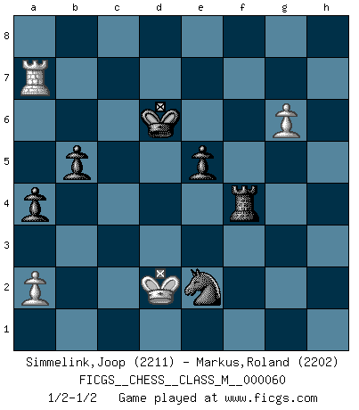Last move : 1/2-1/2 2013 March 12 10:18:46 [Event "FICGS__CHESS__CLASS_M__000060"] [Site "FICGS"] [Date "2012.12.01"] [Round "1"] [White "Simmelink,Joop"] [Black "Markus,Roland"] [Result "1/2-1/2"] [WhiteElo "2211"] [BlackElo "2202"] 1.e4 c6 2.Nf3 d5 3.Nc3 Bg4 4.h3 Bxf3 5.Qxf3 Nf6 6.d3 e6 7.Qg3 g6 8.Be2 Bg7 9.Bf4 Qb6 10.O-O-O d4 11.Na4 Qa5 12.Bxb8 Nd7 13.Bd6 Qxa4 14.Kb1 Qb5 15.h4 Bf8 16.h5 g5 17.Bxf8 Rxf8 18.f4 gxf4 19.Qxf4 Qe5 20.Qh6 Rg8 21.Rdf1 Rg7 22.Rf2 Qg5 23.Qxg5 Rxg5 24.c3 c5 25.Rc1 b5 26.b4 dxc3 27.Rxc3 Ke7 28.Rc1 a6 29.bxc5 Rxc5 30.Rcf1 Rf8 31.d4 Rc3 32.e5 Re3 33.Bf3 f6 34.exf6+ Rxf6 35.Rc2 Rd3 36.Rc6 a5 37.Ra6 a4 38.Kc2 Rxd4 39.Ra7 e5 40.Rd1 Rc4+ 41.Kd2 Rd6+ 42.Ke1 Rxd1+ 43.Kxd1 Kd6 44.g4 Rf4 45.Be2 Nf6 46.g5 Ne4 47.g6 hxg6 48.hxg6 Nc3+ 49.Kd2 Nxe2 1/2-1/2 Caro-Kann defense Queenside Castling by player White (move 10) 10 pieces endgame at move 49 : White KRPP , Black KRNPPP WHITE : King + 1 Rook 2 Pawns BLACK : King + 1 Rook 1 Knight 3 Pawns This chess game ended in a draw. Follow this game move after move (download)The most powerful weapon in Chess is to have the next move. (David Bronstein) Schach ist ein Teil der Kultur, und wenn es mit der Kultur abwärts geht, geht es auch mit dem Schach abwärts. (Mikhail Moiseyevich Botvinik) Me siento como si fuera una pieza en una partida de Ajedrez, cuando mi oponente me indica: esa pieza no puede ser movida. (Soren Kierkegaard) Il s'avisa de me proposer d'apprendre les échecs qu'il jouait un peu... me voilà forcené des échecs. J'achète un échiquier, je m'enferme dans ma chambre, j'y passe des jours et des nuits à vouloir apprendre par cur toutes les parties. (Jean-Jacques Rousseau, Confessions) Knowledge will give you power, but character respect. (Bruce Lee)