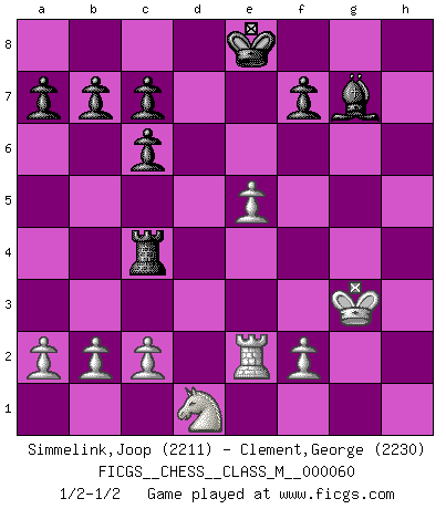 Last move : 1/2-1/2 2013 January 24 22:46:5 [Event "FICGS__CHESS__CLASS_M__000060"] [Site "FICGS"] [Date "2012.12.01"] [Round "1"] [White "Simmelink,Joop"] [Black "Clement,George"] [Result "1/2-1/2"] [WhiteElo "2211"] [BlackElo "2230"] 1.e4 e5 2.Nf3 Nc6 3.Bb5 Nf6 4.O-O Nxe4 5.d4 Nd6 6.Bxc6 dxc6 7.dxe5 Nf5 8.Qxd8+ Kxd8 9.Nc3 Ke8 10.Rd1 h6 11.h3 Be6 12.g4 Ne7 13.Nd4 Rd8 14.Kg2 Bc8 15.Bf4 Ng6 16.Bg3 h5 17.Nf5 Rxd1 18.Rxd1 hxg4 19.hxg4 Bxf5 20.gxf5 Nh4+ 21.Bxh4 Rxh4 22.Kg3 Rc4 23.Re1 Ba3 24.Nd1 Be7 25.f6 Bf8 26.fxg7 Bxg7 27.Re2 1/2-1/2 Joop Simmelink thanks for the game! Ruy Lopez : Berlin defense, Open variation Kingside Castling by player White (move 4) This chess game ended in a draw. Follow this game move after move (download)In the perfect Chess combination as in a first-rate short story, the whole plot and counter-plot should lead up to a striking finale, the interest not being allayed until the very last moment. (Yates and Winter) Der Schachmeister von Heute braucht Courage, einen Killerinstinkt, Ausdauer und Arroganz. (Larry Evans) Un entendimiento minucioso de las típicas continuaciones de mate hacen de las mas complicadas combinaciones de sacrificio que conducen hacia ellas no solo no dificiles, sino casi un asunto de rutina. (Siegbert Tarrasch) Les Echecs sont affaire de jugement sensible. Savoir quand frapper et quand esquiver. (Fischer) My poor ole parrot... Is not in the circulation of displays ....poo hoo hoo :) (Wayne Lowrance's enigma)