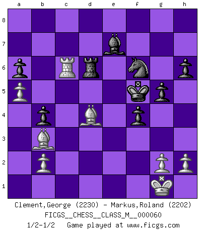 Last move : 1/2-1/2 2013 March 31 20:10:33 [Event "FICGS__CHESS__CLASS_M__000060"] [Site "FICGS"] [Date "2012.12.01"] [Round "1"] [White "Clement,George"] [Black "Markus,Roland"] [Result "1/2-1/2"] [WhiteElo "2230"] [BlackElo "2202"] 1.Nf3 d5 2.d4 Nf6 3.c4 e6 4.Nc3 c6 5.e3 Nbd7 6.Bd3 dxc4 7.Bxc4 b5 8.Bd3 Bb7 9.O-O a6 10.e4 c5 11.d5 Qc7 12.dxe6 fxe6 13.Bc2 Bd6 14.Ng5 Nf8 15.f4 O-O-O 16.Qe1 e5 17.Nd5 Bxd5 18.exd5 exf4 19.Bd2 Re8 20.Qf2 h6 21.Ne6 Nxe6 22.dxe6 Kb8 23.a4 b4 24.Qe2 g5 25.Bb3 Rd8 26.Be1 Qc6 27.a5 Be7 28.Ba4 Qc8 29.Rc1 Rd4 30.Qe5+ Qc7 31.Qxd4 cxd4 32.Rxc7 Kxc7 33.Bf2 Rd8 34.Rc1+ Kd6 35.Bxd4 Kxe6 36.Rc6+ Rd6 37.Bb3+ Kf5 38.Bc2+ Ke6 39.Bb3+ Kf5 1/2-1/2 Reti Opening Kingside Castling by player White (move 9) Queenside Castling by player Black (move 15) This chess game ended in a draw. Follow this game move after move (download)A good player is always lucky. (Jose Raul Capablanca) Deine Wertungszahl - vorausgesetzt einige Jahre schachliche Anstrengung - entspricht etwa dem zehnfachen Deines IQ plus 1000. (Jonathan Levitt) Todo lo que importa ante el tablero de Ajedrez son buenas jugadas. (Bobby Fischer) Le pion, dans sa simplicité, marche droit devant lui, mais lorsqu'il prend, il le fait obliquement? Ainsi l'homme, tant qu'il reste pauvre, marche dans la droiture et vit honnêtement, mais lorsqu'il recherche les honneurs, il flatte, se parjure et, par les voies obliques, cherche une position supérieure sur l'échiquier du monde. (Jean de Galles) Art disturbs, science reassures. (Georges Braque, Le Jour et la Nuit)