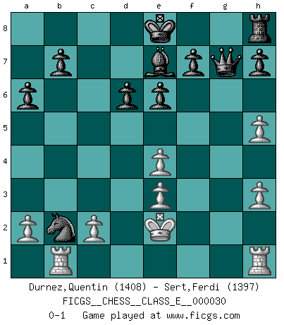 Last move : 0-1 2007 March 17 15:14:26 [Event "FICGS__CHESS__CLASS_E__000030"] [Site "FICGS"] [Date "2007.01.19"] [Round "1"] [White "Durnez,Quentin"] [Black "Sert,Ferdi"] [Result "0-1"] [WhiteElo "1408"] [BlackElo "1397"] 1.e4 c5 2.Nf3 d6 3.d4 cxd4 4.Nxd4 Nf6 5.Nc3 a6 6.Be3 Ng4 7.Qf3 Nxe3 8.fxe3 Nd7 9.Bc4 Ne5 10.Qe2 Bg4 11.Qf1 Rc8 12.h3 Bh5 13.g4 Nxc4 14.gxh5 Nxb2 15.Nde2 Qa5 16.Qf5 Rc5 17.Qg4 Rxc3 18.Nxc3 Qxc3+ 19.Ke2 e6 20.Rab1 Be7 21.Qxg7 Qxg7 0-1 Sicilian : Najdorf, Byrne (English) attack Player Black won this chess game. Follow this game move after move (download)I don't believe in psychology. I believe in good moves. (Bobby Fischer) Glücklicherweise sind Großmeister Ruben Fines reine Schachbücher weniger phallozentrisch [als seine Schachpsychologie] und deswegen auch weniger lächerlich. (Nigel Short) Coloca el contenido de las piezas del Ajedrez en un sombrero, agitalo vigorosamente, arrojalas en un tablero desde una altura de 30 centimetros y así obtendras el estilo de Steinitz. (H. E. Bird) Les Echecs représentent une sphère d'idées créatrices basée sur la volonté des deux protagonistes. (Smyslov) He who defends everything defends nothing. (Frederick the Great)