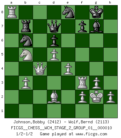 Last move : 1/2-1/2 2013 February 18 10:41:3 [Event "FICGS__CHESS__WCH_STAGE_2_GROUP_01__000010"] [Site "FICGS"] [Date "2012.12.03"] [Round "1"] [White "Johnson,Bobby"] [Black "Wolf,Bernd"] [Result "1/2-1/2"] [WhiteElo "2412"] [BlackElo "2113"] 1.d4 Nf6 2.c4 c5 3.d5 b5 4.cxb5 a6 5.bxa6 Bxa6 6.Nc3 g6 7.e4 Bxf1 8.Kxf1 d6 9.g3 Bg7 10.Nf3 O-O 11.Kg2 Nbd7 12.a4 Qb6 13.Qe2 Rfb8 14.Nb5 Ne8 15.Bg5 h6 16.Bxe7 Rb7 17.Ra3 Nb8 18.Bh4 g5 19.Nxg5 hxg5 20.Bxg5 Na6 21.Rb3 Qa5 22.Ra1 c4 23.Bd2 Qd8 24.Qxc4 Nc5 25.Rf3 Qd7 26.Ra2 Nxa4 27.b3 Nb6 28.Rxa8 1/2-1/2 Benko gambit accepted Kingside Castling by player Black (move 10) This chess game ended in a draw. Follow this game move after move (download)By the beauty of his games, the clarity of his play, and the brilliance of his ideas, Fischer made himself an artist of the same stature as Brahms, Rembrandt, and Shakespeare. (David Levy) Ein Remis kann durch Wiederholung von drei Zügen oder durch einen schlechte Zug erreicht werden. (Savielly Grigorievitsch Tartakower) En la perfecta combinación de Ajedrez como en una historia corta de primera clase, toda la trama y contra trama deberá conducir hacia un final sorprendente, el interes no es mitigado hasta el último momento. (Yates and Winter) Il vaut mieux sacrifier les pièces de l'adversaire. (Xavier Tartacover) Now you put water in a cup, it becomes the cup; You put water into a bottle it becomes the bottle; You put it in a teapot it becomes the teapot. Water can flow or it can crash. Be water, my friend. (Bruce Lee)