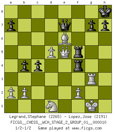 Last move : 1/2-1/2 2013 April 7 7:31:28 [Event "FICGS__CHESS__WCH_STAGE_2_GROUP_01__000010"] [Site "FICGS"] [Date "2012.12.03"] [Round "1"] [White "Legrand,Stephane"] [Black "Lopez,Jose"] [Result "1/2-1/2"] [WhiteElo "2265"] [BlackElo "2191"] 1.d4 d5 2.c4 e6 3.Nc3 c6 4.e3 Nf6 5.Nf3 Nbd7 6.Qc2 Bd6 7.Be2 O-O 8.O-O dxc4 9.Bxc4 b5 10.Be2 Bb7 11.Rd1 Qc7 12.e4 e5 13.Bg5 exd4 14.Rxd4 Ne5 15.g3 Bc5 16.Rd2 Nfg4 17.Nd1 Bb6 18.Nd4 Bxd4 19.Rxd4 c5 20.Bf4 f5 21.Rc1 c4 22.h3 Qb6 23.Rd5 Bxd5 24.exd5 Ng6 25.hxg4 Nxf4 26.gxf4 fxg4 27.Bxg4 Rxf4 28.Be6+ Kh8 29.Qc3 Raf8 30.Rc2 Qd8 31.Qe5 Qe8 32.Rc3 R4f5 33.Qe4 Rf4 34.Qe2 Qe7 35.Rg3 b4 36.Qe5 R8f5 37.Qe3 Rf8 38.Qe5 R8f5 1/2-1/2 QGD : Semi-Slav Kingside Castling by player Black (move 7) Kingside Castling by player White (move 8) This chess game ended in a draw. Follow this game move after move (download)If Chess is a science, it's a most inexact one. If Chess is an art, it is too exacting to be seen as one. If Chess is a sport, it's too esoteric. If Chess is a game, it's too demanding to be just a game. If Chess is a mistress, she's a demanding one. If Chess is a passion, it's a rewarding one. If Chess is life, it's a sad one. (Unknown) Versuche, dich von der Sklaverei der Eröffnungsvarianten zu befreien. Stattdessen soll man gewisse Typenpositionen erlernen, die man eingehend analysiert. (Aaron Nimzowitsch) Todos los jugadores de Ajedrez deberían tener un pasatiempo. (Savielly Tartakower) Avant la finale, les dieux ont créé le milieu de partie. (Tarrasch) The only thing that overcomes hard luck is hard work. (Harry Golden)