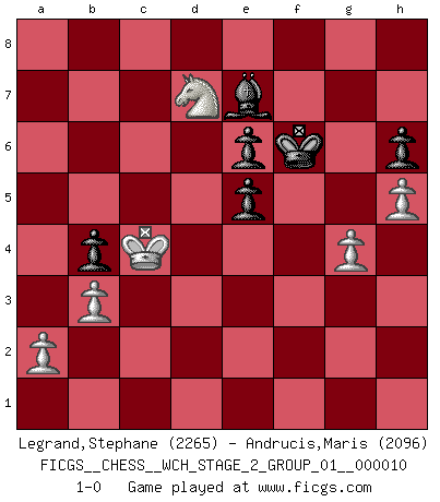 Last move : 1-0 2013 April 24 17:10:56 [Event "FICGS__CHESS__WCH_STAGE_2_GROUP_01__000010"] [Site "FICGS"] [Date "2012.12.03"] [Round "1"] [White "Legrand,Stephane"] [Black "Andrucis,Maris"] [Result "1-0"] [WhiteElo "2265"] [BlackElo "2096"] 1.d4 Nf6 2.c4 e6 3.g3 d5 4.Nf3 Be7 5.Bg2 O-O 6.O-O dxc4 7.Qc2 c5 8.dxc5 Qd5 9.Na3 Nc6 10.Nxc4 Qxc5 11.b3 Nd5 12.e4 Ndb4 13.Qe2 b5 14.Be3 Qh5 15.Nb2 Ne5 16.Rae1 Nbc6 17.Nxe5 Qxe2 18.Rxe2 Nxe5 19.Rd1 Ng4 20.Bc1 Ba6 21.h3 Nf6 22.Bg5 Rfd8 23.e5 Rxd1+ 24.Nxd1 Rd8 25.Ne3 Nd5 26.Nxd5 Bxg5 27.Nb4 Bc8 28.Nc6 Rd1+ 29.Kh2 Bd7 30.f4 Bh6 31.Nxa7 g5 32.fxg5 Bxg5 33.Bc6 Bxc6 34.Nxc6 Rc1 35.Nd4 b4 36.h4 Be7 37.h5 Kg7 38.Kh3 Bc5 39.Rc2 Rxc2 40.Nxc2 f6 41.Ne1 fxe5 42.Nd3 Bd6 43.Nf2 Bc5 44.Ne4 Be7 45.Kg2 Kf7 46.Kf3 Kg7 47.Ke3 Kf7 48.Kd3 Kg7 49.g4 h6 50.Kc4 Kf7 51.Nc5 Kf6 52.Nd7+ 1-0 Catalan Opening Kingside Castling by player Black (move 5) Kingside Castling by player White (move 6) Player White won this chess game. Follow this game move after move (download)The enormous mental resilience, without which no Chess player can exist, was so much taken up by Chess that he could never free his mind of this game. (Albert Einstein) Ein Gewinn durch eine ungenaue Kombination, sei sie auch noch so vorzeigbar, erfüllt mich mit Schaudern. (Wilhelm Steinitz) Observen a Garry Kasparov. Después de una derrota, invariablemente el gana la próxima partida. Prácticamente hace pedazos a su siguiente oponente. Eso es algo que tenemos que aprender a lograr. (Maurice Ashley) Ne tendez aucun piège pour le plaisir ! Ne jouez rien dans l'espoir que l'adversaire réagisse de façon stupide ! Prenez toujours pour acquis que l'adversaire va trouver le meilleur coup ! Ne jouez jamais de coup dans l'espoir que l'adversaire ne voie pas la menace ! Chacun de vos coups doit améliorer la position d'une façon ou d'une autre. A proverb is a short sentence based on long experience. (Miguel de Cervantes)