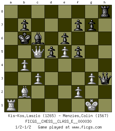 Last move : 1/2-1/2 2007 March 20 20:33:42 [Event "FICGS__CHESS__CLASS_E__000030"] [Site "FICGS"] [Date "2007.01.19"] [Round "1"] [White "Kis-Kos,Laszlo"] [Black "Menzies,Colin"] [Result "1/2-1/2"] [WhiteElo "1265"] [BlackElo "1567"] 1.e4 e6 2.d4 d5 3.Nc3 Bb4 4.e5 c5 5.a3 cxd4 6.axb4 dxc3 7.Nf3 cxb2 8.Bxb2 Ne7 9.Bd3 Nbc6 10.c3 Ng6 11.Bxg6 hxg6 12.O-O Bd7 13.Qd2 Ne7 14.Rfd1 Nf5 15.Nd4 Rxh2 16.Kxh2 Qh4+ 17.Kg1 O-O-O 18.Nxf5 gxf5 19.Rxa7 Kc7 20.g3 Qh3 21.Qd4 Rh8 22.Qc5+ Bc6 23.Qe7+ Kb8 24.Qd6+ Kxa7 25.Ra1+ Kb6 26.Qc5+ 1/2-1/2 French : Winawer, Advance, Rauzer variation Kingside Castling by player White (move 12) Queenside Castling by player Black (move 17) This chess game ended in a draw. Follow this game move after move (download)Becoming successful at Chess allows you to discover your own personality. That's what I want for the kids I teach. (Saudin Robovic) Ein Isolani verdüstert die Stimmung auf dem ganzen Schachbrett. (Savielly Grigorievitsch Tartakower) El Ajedrez es 99 por ciento táctica. (Teichmann) Dans le domaine de la peinture, de la gravure et de la sculpture, dès la première décennie de notre siècle, les artistes abandonnent la représentation de la partie d'échecs pour se concentrer sur les pièces, sur les échiquiers et sur toutes les variations auxquelles les unes et les autres peuvent donner lieu. On passe en quelque sorte d'un thème social à un thème musical (au sens de la musica médiévale, c'est-à-dire d'une notion qui inclue le rythme, l'harmonie, la construction et la déconstruction, etc.). Graphiquement et picturalement, l'échiquier apparaît comme une structure ouverte, dynamique, d'une richesse infinie, autorisant toutes les combinatoires et débouchant sur des mouvements et des rythmes de nature exponentielle. (Michel Pastoureau) Mac users swear by their computers. PC users swear at their computers. (Author unknown)
