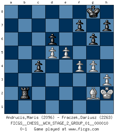 Last move : 0-1 2013 March 2 22:45:54 [Event "FICGS__CHESS__WCH_STAGE_2_GROUP_01__000010"] [Site "FICGS"] [Date "2012.12.03"] [Round "1"] [White "Andrucis,Maris"] [Black "Fraczek,Dariusz"] [Result "0-1"] [WhiteElo "2096"] [BlackElo "2263"] 1.e4 c5 2.Nc3 d6 3.Nge2 Nf6 4.g3 g6 5.Bg2 Bg7 6.O-O Nc6 7.d3 O-O 8.h3 Rb8 9.Be3 b5 10.a3 a5 11.Qd2 b4 12.axb4 axb4 13.Nd5 Ne8 14.Bh6 Bxb2 15.Bxf8 Bxa1 16.Nxe7+ Nxe7 17.Bxe7 Qxe7 18.Rxa1 Nc7 19.Ra7 Qd8 20.d4 Be6 21.d5 Bd7 22.Kh2 Nb5 23.Ra2 Na3 24.Qc1 Ba4 25.f4 Qe8 26.Ng1 Bxc2 27.Rxc2 Nxc2 28.Qxc2 b3 29.Qb1 Qa4 30.Ne2 Qa2 31.Qd1 b2 32.Nc3 b1Q 33.Qxb1 Qxb1 34.Nxb1 Rxb1 35.g4 c4 36.e5 Rb2 0-1 Sicilian : Closed Kingside Castling by player White (move 6) Kingside Castling by player Black (move 7) Promotion Queen by player Black (move 32) Player Black won this chess game. Follow this game move after move (download)It is no time to be playing Chess when the house is on fire. (Italian Proverb) Karpov ist ein Museumsstück. (Garry Kasparov) Cuando me preguntan: -¿Cual es el secreto que te hace hacer mejores movidas que tus oponentes?, Yo respondo: Me da gusto que me pregunten eso, porque, como veran, hay una simple razón. Yo pienso mis propias movidas y dejo a mi oponente que el piense las suyas. (Alexander Alekhine) Les sacrifices démontrent seulement que quelqu'un a gaffé. (Savielly Tartacover) They say poker is a zero-sum game. It must be, because every time I play my sum ends up zero. (Max Shapiro)