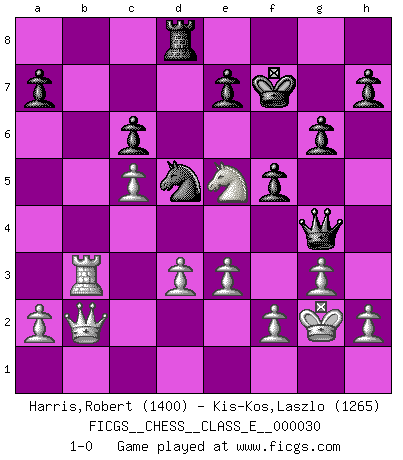 Last move : 1-0 2007 March 1 5:18:30 [Event "FICGS__CHESS__CLASS_E__000030"] [Site "FICGS"] [Date "2007.01.19"] [Round "1"] [White "Harris,Robert"] [Black "Kis-Kos,Laszlo"] [Result "1-0"] [WhiteElo "1400"] [BlackElo "1265"] 1.c4 Nf6 2.Nc3 g6 3.g3 d5 4.cxd5 Nxd5 5.Bg2 Nxc3 6.bxc3 Bg7 7.Rb1 c6 8.Nf3 O-O 9.O-O Nd7 10.c4 Nb6 11.d3 Bd7 12.c5 Nd5 13.Rxb7 Qc8 14.Rb3 Bh3 15.Bb2 Bxg2 16.Kxg2 Rd8 17.Bxg7 Kxg7 18.Qc2 Rb8 19.Rfb1 Rxb3 20.Rxb3 Qg4 21.e3 f5 22.Qb2+ Kf7 23.Ne5+ 1-0 English Opening Kingside Castling by player Black (move 8) Kingside Castling by player White (move 9) Player White won this chess game. Follow this game move after move (download)Chess is 99 percent tactics. (Teichmann) Ja, jede Frau in Holland liebt mich bestimmt, und alle Männer hassen mich. (Loek van Wely) Debió haber existido una vez en que los hombres eran semidióses, de otra manera no hubiesen podido inventar el Ajedrez. (Gustav Schenk) Je fais ceci parce que dans cinquante coups j'obtiendrai cela; je m'appelle Mikhail Moisevitch Botvinnik. (Botvinnik) Whoever said the pen is mightier than the sword obviously never encountered automatic weapons. (US General Douglas MacArthur)