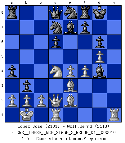 Last move : 1-0 2013 February 12 12:38:52 [Event "FICGS__CHESS__WCH_STAGE_2_GROUP_01__000010"] [Site "FICGS"] [Date "2012.12.03"] [Round "1"] [White "Lopez,Jose"] [Black "Wolf,Bernd"] [Result "1-0"] [WhiteElo "2191"] [BlackElo "2113"] 1.e4 c5 2.Nf3 d6 3.d4 Nf6 4.Nc3 cxd4 5.Nxd4 a6 6.Be3 e5 7.Nb3 Be6 8.f3 Be7 9.Qd2 O-O 10.O-O-O Nbd7 11.g4 b5 12.g5 b4 13.Ne2 Ne8 14.f4 g6 15.h4 a5 16.h5 a4 17.Nbd4 b3 18.Kb1 exd4 19.Nxd4 Bg4 20.hxg6 hxg6 21.Be2 1-0 Sicilian Kingside Castling by player Black (move 9) Queenside Castling by player White (move 10) Player White won this chess game. Follow this game move after move (download)I won't play with you anymore. You have insulted my friend. - When an opponent cursed himself for a blunder. (Miguel Najdorf) Ich organisiere ein großes Turnier, was mich etwa 120000 Dollar kostet. Ich denke, das ist das erste Mal in der Schachgeschichte, daß ein Schachgroßmeister auch als Mäzen auftritt. (Miguel Najdorf) Una compensación adecuada por un sacrificio es tener una combinación sólida que conduce a una posición ganadora; una compensación adecuada por una metida de pata es dejar a tu oponente arrebatar una derrota de las fauces de la victoria. (Bruce A. Moon) Echiquier : carré parfait, comme la Jérusalem nouvelle décrite par l'auteur de l'Apocalypse, huit cases sur huit, exaltation du chiffre 4, symbole du cosmos aux quatre horizons... où le noir et le blanc, l'ombre et la lumière, le mal et le bien s'entremêlent et se conjuguent. (Robert Couffignal, Le Gambit du poète) My poor ole parrot... Is not in the circulation of displays ....poo hoo hoo :) (Wayne Lowrance's enigma)