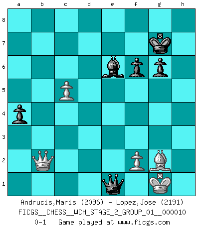 Last move : 0-1 2013 April 27 21:26:12 [Event "FICGS__CHESS__WCH_STAGE_2_GROUP_01__000010"] [Site "FICGS"] [Date "2012.12.03"] [Round "1"] [White "Andrucis,Maris"] [Black "Lopez,Jose"] [Result "0-1"] [WhiteElo "2096"] [BlackElo "2191"] 1.e4 c5 2.Nc3 Nc6 3.g3 g6 4.Nge2 Bg7 5.Bg2 d6 6.O-O Nf6 7.d3 O-O 8.Bg5 Re8 9.Qd2 a6 10.h3 Bd7 11.Bh6 Bxh6 12.Qxh6 Qb6 13.Rab1 Nd4 14.Nxd4 cxd4 15.Nd5 Nxd5 16.exd5 Qa5 17.Rbe1 e5 18.dxe6 Rxe6 19.Rxe6 Bxe6 20.Qf4 Qe5 21.Qd2 Rc8 22.a3 Qb5 23.b3 b6 24.Re1 Qc5 25.Qf4 Qxa3 26.Qf6 Qc5 27.g4 Rf8 28.Re2 Bd7 29.g5 a5 30.h4 Be6 31.h5 Qf5 32.Qxd4 Qxg5 33.hxg6 hxg6 34.Qxd6 b5 35.Qe5 Qc1+ 36.Bf1 Bd7 37.Re4 Re8 38.Qd6 Rxe4 39.dxe4 Qg5+ 40.Kh2 Qh4+ 41.Kg1 Qg4+ 42.Bg2 a4 43.bxa4 bxa4 44.c4 Be6 45.Qd8+ Kh7 46.Qd3 Qh5 47.Qa3 Qd1+ 48.Bf1 Qe1 49.c5 Qxe4 50.Qg3 Kg8 51.Qb8+ Kg7 52.Qb2+ f6 53.Bg2 Qe1+ 0-1 This chess game has been lost on time (started : 2012.12.03 13:32:14) Sicilian : Closed Kingside Castling by player White (move 6) Kingside Castling by player Black (move 7) Player Black won this chess game. Follow this game move after move (download)For me, Chess is life and every game is like a new life. Every Chess player gets to live many lives in one lifetime. (Eduard Gufeld) Das Blackmar-Diemer-Gambit verändert den ganzen Menschen! (Emil Joseph Diemer) Evita las multitudes. Haz independientemente tu propio razonamiento. Trata de ser el jugador de Ajedrez, no la pieza de Ajedrez. (Ralph Charell) Les écrivains ont utilisé les échecs pour analyser les côtés extrêmes de la nature humaine. Dans ce cadre, les échecs offrent un champ d'expérimentation idéal. Mais on pourrait faire la même chose avec la peinture. Et là, en vous référant à Van Gogh, vous ne tirerez pas de conclusion définitive sur les peintres. (Gary Kasparov) If you are good, you will be assigned all the work. If you are really good, you will get out of it. (Dan Rotaru)