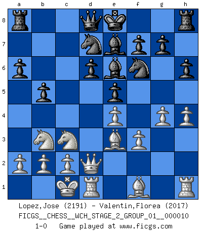 Last move : 1-0 2013 March 8 17:17:27 [Event "FICGS__CHESS__WCH_STAGE_2_GROUP_01__000010"] [Site "FICGS"] [Date "2012.12.03"] [Round "1"] [White "Lopez,Jose"] [Black "Valentin,Florea"] [Result "1-0"] [WhiteElo "2191"] [BlackElo "2017"] 1.e4 c5 2.Nf3 d6 3.d4 cxd4 4.Nxd4 Nf6 5.Nc3 a6 6.Be3 e5 7.Nb3 Be6 8.f3 Nbd7 9.Qd2 Be7 10.g4 h6 11.O-O-O b5 12.h4 1-0 This chess game has been lost on time (started : 2012.12.03 13:32:14) Sicilian : Najdorf, Byrne (English) attack Queenside Castling by player White (move 11) Player White won this chess game. Follow this game move after move (download)The passed pawn is a criminal, who should be kept under lock and key. Mild measures, such as police surveillance, are not sufficient. (Nimzovitch) Wenn man heute mit 14 Jahren noch kein GM ist, kann man es vergessen. (Viswanathan Anand) No es tiempo de jugar al Ajedrez cuando la casa esta en llamas. (Proverbio Italiano) Les ravages du H expliquent la différence de niveau entre Tal et Thal [Abergel]. I take risks, sometimes patients die, but not taking risks causes more patients to die. So I guess my biggest problem is I've been cursed with the ability to do the math. (Gregory House, House M.D.)