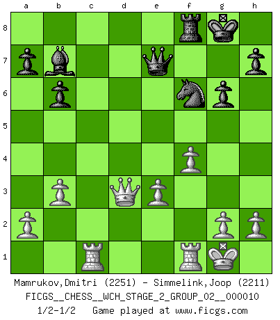 Last move : 1/2-1/2 2012 December 12 19:32:15 [Event "FICGS__CHESS__WCH_STAGE_2_GROUP_02__000010"] [Site "FICGS"] [Date "2012.12.03"] [Round "1"] [White "Mamrukov,Dmitri"] [Black "Simmelink,Joop"] [Result "1/2-1/2"] [WhiteElo "2251"] [BlackElo "2211"] 1.d4 d5 2.c4 c6 3.Nc3 Nf6 4.e3 e6 5.Nf3 Nbd7 6.b3 Bb4 7.Bd2 Qe7 8.Be2 O-O 9.O-O b6 10.Qc2 Bb7 11.Rad1 Rac8 12.Ne5 Nxe5 13.dxe5 Nd7 14.f4 f6 15.Bd3 g6 16.exf6 Nxf6 17.Bc1 Bd6 18.Qe2 e5 19.cxd5 cxd5 20.Nb5 e4 21.Nxd6 Rxc1 22.Nxe4 dxe4 23.Rxc1 exd3 24.Qxd3 1/2-1/2 QGD Slav defense Kingside Castling by player Black (move 8) Kingside Castling by player White (move 9) This chess game ended in a draw. Follow this game move after move (download)Before the endgame, the Gods have placed the middle game. (Siegbert Tarrasch) Es ist peinlich, dass ich nie Weltmeister wurde. Es wäre leicht, Leonid Breschnjew als Ursache vorzuschieben, dessen Apparat den Vorzeigekommunisten Anatoli Karpow in allem unterstützte. Aber Garri Kasparow zum Beispiel, der ebenfalls von den Sowjets unerwünscht war, hat trotz der Widerstände den WM-Titel erobert. (Viktor Kortschnoi) Si no le temes a Spassky, entonces elimino el elemento del dinero. (Jim Slater) Le profane ne songe pas à la somme de jouissance dont il se prive, qui méconnaît ce jeu aux ressources aussi variées que passionnantes. (Jean-Marie Jeanton-Lamarche) To be champion requires more than simply being a strong player; one has to be a strong human being as well. (Anatoly Karpov)