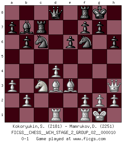 Last move : 0-1 2013 February 27 4:24:46 [Event "FICGS__CHESS__WCH_STAGE_2_GROUP_02__000010"] [Site "FICGS"] [Date "2012.12.03"] [Round "1"] [White "Kokoryukin,Sergey"] [Black "Mamrukov,Dmitri"] [Result "0-1"] [WhiteElo "2181"] [BlackElo "2251"] 1.d4 Nf6 2.c4 e6 3.Nc3 Bb4 4.e3 c5 5.Nge2 d5 6.a3 Bxc3+ 7.Nxc3 cxd4 8.exd4 dxc4 9.Bxc4 Nc6 10.Be3 O-O 11.O-O b6 12.Qf3 Bb7 13.Bd3 Rc8 14.Rad1 Rc7 15.Qh3 h6 0-1 This chess game has been lost on time (started : 2012.12.03 13:32:16) Nimzo-Indian : 4.e3 c5 Kingside Castling by player Black (move 10) Kingside Castling by player White (move 11) Player Black won this chess game. Follow this game move after move (download)Only the player with the initiative has the right to attack. (Wilhelm Steinitz) Das Schachspiel übertrifft alle anderen Spiele so weit wie der Chimborasso einen Misthaufen. (Arthur Schopenhauer) Tu sabes, camarada Pachman, no disfruto el ser un Ministro, preferería jugar al Ajedrez como tu. (Che Guevara) Ne tendez aucun piège pour le plaisir ! Ne jouez rien dans l'espoir que l'adversaire réagisse de façon stupide ! Prenez toujours pour acquis que l'adversaire va trouver le meilleur coup ! Ne jouez jamais de coup dans l'espoir que l'adversaire ne voie pas la menace ! Chacun de vos coups doit améliorer la position d'une façon ou d'une autre. It is a good thing for an uneducated man to read books of quotations. (Winston Churchill)