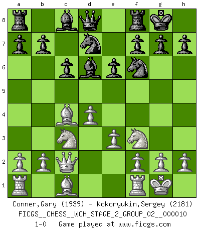 Last move : 1-0 2013 February 22 16:1:49 [Event "FICGS__CHESS__WCH_STAGE_2_GROUP_02__000010"] [Site "FICGS"] [Date "2012.12.03"] [Round "1"] [White "Conner,Gary"] [Black "Kokoryukin,Sergey"] [Result "1-0"] [WhiteElo "1939"] [BlackElo "2181"] 1.d4 d5 2.c4 c6 3.Nf3 Nf6 4.Nc3 e6 5.e3 Nbd7 6.Qc2 Bd6 7.Bd3 O-O 8.O-O dxc4 9.Bxc4 1-0 This chess game has been lost on time (started : 2012.12.03 13:32:16) QGD Slav : 4.Nc3 Kingside Castling by player Black (move 7) Kingside Castling by player White (move 8) Player White won this chess game. Follow this game move after move (download)We must make sure that Chess will not be like a dead language, very interesting, but for a very small group. (Sytze Faber) Sie bekommen vielleicht den Eindruck, dass die Spitzenspieler überhaupt gar nicht so stark sind. Aber das stimmt nicht. Es ist eine Illusion. Mit einem Computer an der Seite ist es sehr leicht, Urteile zu fällen, aber wenn man alleine am Brett sitzt, sieht die Sache ganz anders aus. (Vladimir Kramnik) Después de una mala apertura, hay una esperanza en el juego medio. Pero una vez que estas en finales, el momento de la verdad ha llegado. (Edmar Mednis) Mais n'est-ce pas déjà le limiter injurieusement que d'appeler les échecs un jeu? N'est-ce pas aussi une science, un art, ou quelque chose qui, comme le cercueil de Mahomet entre ciel et terre, est suspendu entre l'un et l'autre, et qui réunit un nombre incroyable de contraires ? (Stefan Zweig) Methinks King Thibault should dub Marius Zubac a knight of the square board... I mean table, henceforth addressing him as Sir Marius, and bestow on him a suitable land from the kingdom of FICGS & marry him off to a worthy, fair maiden, lest he slice our heads with his mighty sword in his wrath. (Dinesh De Silva)