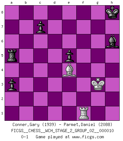 Last move : 0-1 2013 February 2 0:1:12 [Event "FICGS__CHESS__WCH_STAGE_2_GROUP_02__000010"] [Site "FICGS"] [Date "2012.12.03"] [Round "1"] [White "Conner,Gary"] [Black "Parmet,Daniel"] [Result "0-1"] [WhiteElo "1939"] [BlackElo "2088"] 1.d4 Nf6 2.c4 g6 3.Nc3 Bg7 4.e4 d6 5.Nf3 O-O 6.Be2 Nc6 7.O-O e5 8.d5 Ne7 9.b4 Nh5 10.Re1 f5 11.Ng5 Nf6 12.f3 Kh8 13.Rb1 h6 14.Ne6 Bxe6 15.dxe6 fxe4 16.fxe4 Nc6 17.Nd5 Ng8 18.Bd3 Nd4 19.Qg4 g5 20.h4 Nf6 21.Qg3 Nxe6 22.hxg5 Nh5 23.Qh2 Nhf4 24.gxh6 Bf6 25.Be2 Rg8 26.Nxf4 exf4 27.Bxf4 Nxf4 28.Qxf4 Bd4+ 29.Kh1 Be5 30.Qf5 a5 31.b5 Qh4+ 32.Qh3 Qf2 33.Bg4 Raf8 34.g3 Qxa2 35.Rg1 Qxc4 36.Bf5 Qd3 37.Rbf1 Rg5 38.Bg6 Ra8 39.Bf5 a4 40.Bc8 Qxe4+ 41.Rg2 Rg8 42.Bf5 Qe3 43.Bc2 Rxg3 44.Rxg3 Bxg3 45.Bf5 a3 46.Bc8 Qe4+ 47.Kg1 Bf4 48.Qc3+ Qe5 49.Qxe5+ dxe5 50.Bxb7 Ra5 51.Be4 Bxh6 52.Kf2 Rxb5 53.Kg3 Ra5 0-1 Comment by player 2 : Daniel Parmet : Good game. What was the book you were following? By my notes, 25. Be2 is both the novelty and the mistake that lost the game for you. Up until then, it was dynamically equal. After 25 Be2N it is lost for white. There have been several famous OTB games in this line. Daniel Parmet Good game. What was the book you were following? By my notes, 25. Be2 is both the novelty and the mistake that lost the game for you. Up until then, it was dynamically equal. After 25 Be2N it is lost for white. There have been several famous OTB games in this line. Gary Conner It was from http://www.chess.com/article/view/the-kid-bayonet-attack-by-gm-arun-and-gm-magesh-part-2 wely-radjabov, wijk aan zee 2009. Analysis by Arun & Magresh, You are correct, 25. Be2 was not good. The principle alternative seemed to Bxf4, which I found unappealing. Re3 was also considered. King's Indian : 6.Be2 Kingside Castling by player Black (move 5) Kingside Castling by player White (move 7) 10 pieces endgame at move 51 : White KRBP , Black KRBPPP WHITE : King + 1 Rook 1 Bishop 1 Pawn BLACK : King + 1 Rook 1 Bishop 3 Pawns 9 pieces endgame at move 52 : White KRB , Black KRBPPP WHITE : King + 1 Rook 1 Bishop BLACK : King + 1 Rook 1 Bishop 3 Pawns Player Black won this chess game. Follow this game move after move (download)Nothing excites jaded Grandmasters more than a theoretical novelty. (Dominic Lawson) Wer wird heute Abend ihr Gegner sein? -- Heute Abend spiele ich gegen die schwarzen Steine. (Akiba Rubinstein) El Ajedrez se juega con la mente... ¡no con las manos!. (Renaud y Kahn) Avant la finale, les dieux ont créé le milieu de partie. (Tarrasch) The Internet is the world's largest library. It's just that all the books are on the floor. (John Allen Paulos)