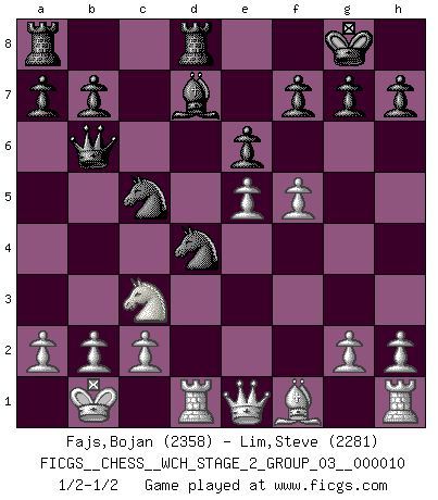 Last move : 1/2-1/2 2013 March 23 20:1:48 [Event "FICGS__CHESS__WCH_STAGE_2_GROUP_03__000010"] [Site "FICGS"] [Date "2012.12.03"] [Round "1"] [White "Fajs,Bojan"] [Black "Lim,Steve"] [Result "1/2-1/2"] [WhiteElo "2358"] [BlackElo "2281"] 1.e4 e6 2.d4 d5 3.Nc3 Nf6 4.e5 Nfd7 5.Be3 c5 6.f4 cxd4 7.Qxd4 Nc6 8.Qd2 Bc5 9.Nf3 Qb6 10.Bxc5 Nxc5 11.O-O-O O-O 12.Kb1 Rd8 13.Qe1 Bd7 14.f5 d4 15.Nxd4 Nxd4 1/2-1/2 French : Steinitz variation Queenside Castling by player White (move 11) Kingside Castling by player Black (move 11) This chess game ended in a draw. Follow this game move after move (download)One doesn't have to play well, it's enough to play better than your opponent. (Siegbert Tarrasch) Ich verlor meine Bürgerrechte, mein Gehalt wurde mir nicht mehr bezahlt und ich wurde zensiert und durfte nicht mehr ins Ausland reisen. [nach dem Match Fischer-Taimanov 6:0] (Mark Taimanov) Me gusta decir que Bobby Fischer fue el mejor jugador que jamás haya existido. Pero lo que hizo de Fischer un genio, fue su habilidad de mezclar una frescura y pragmatismo Americano con ideas Rusas acerca de la estrategia. (Bruce Pandolfini) Lorsque vous vous retrouvez devant une position atroce, ne tendez pas un ultime piège dérisoire avec l'intention d'abandonner si l'adversaire le déjoue ! Faites-vous plutôt un devoir de résister comme si votre vie en dépendait. Jouez le coup qui vous déplairait au centuple si vous étiez dans la peau de votre tortionnaire ! We cannot be sure of having something to live for unless we are willing to die for it. (Ernesto Che Guevara)