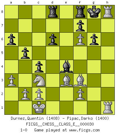 Last move : 1-0 2007 April 2 15:12:1 [Event "FICGS__CHESS__CLASS_E__000030"] [Site "FICGS"] [Date "2007.01.19"] [Round "1"] [White "Durnez,Quentin"] [Black "Pipac,Darko"] [Result "1-0"] [WhiteElo "1408"] [BlackElo "1400"] 1.e4 e5 2.Nf3 Nc6 3.d4 exd4 4.Nxd4 Nxd4 5.Qxd4 c5 6.Qe5+ Qe7 7.Qxe7+ Bxe7 8.Be3 Nf6 9.Nc3 O-O 10.O-O-O d6 11.a3 a6 12.Bd3 b5 13.h4 c4 14.Be2 Bb7 15.Bf3 Rad8 16.Rh3 Bc6 17.g4 h6 18.g5 hxg5 19.hxg5 Nh7 20.Rdh1 g6 21.Rxh7 Bf6 22.gxf6 Bxe4 23.Rh8+ 1-0 Scotch game Kingside Castling by player Black (move 9) Queenside Castling by player White (move 10) Player White won this chess game. Follow this game move after move (download)It's always better to sacrifice your opponent's men. (Savielly Tartakover) Wer wird heute Abend ihr Gegner sein? -- Heute Abend spiele ich gegen die schwarzen Steine. (Akiba Rubinstein) a manera como él juega al Ajedrez, demuestra la completa naturaleza de un hombre. (Stanley Ellin) Si le désir cupide (et stupide) de gagner est une inépuisable source de souffrance, une combinaison brillante sur l'échiquier est une découverte : le coquelicot qui s'épanouit lorsque apparaît la Voie Lactée. (Arrabal) I've lost money so fast in these clubs it's left me reeling. I've read every poker book ever written, but the only way to get better at the game is to go out and play with people who are really good. The problem is, you stand to lose a lot of money doing it. (Matt Damon)