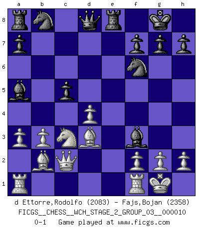 Last move : 0-1 2013 April 2 20:24:35 [Event "FICGS__CHESS__WCH_STAGE_2_GROUP_03__000010"] [Site "FICGS"] [Date "2012.12.03"] [Round "1"] [White "d Ettorre,Rodolfo"] [Black "Fajs,Bojan"] [Result "0-1"] [WhiteElo "2083"] [BlackElo "2358"] 1.d4 Nf6 2.c4 e6 3.Nc3 Bb4 4.e3 O-O 5.Bd3 d5 6.Nf3 b6 7.O-O c5 8.dxc5 bxc5 9.Qc2 Bb7 10.cxd5 exd5 11.a3 Ba5 12.b3 Re8 13.Bb2 d4 14.exd4 Bxf3 0-1 This chess game has been lost on time (started : 2012.12.03 13:32:17) Nimzo-Indian : 4.e3 O-O, 5.Bd3 d5 Kingside Castling by player Black (move 4) Kingside Castling by player White (move 7) Player Black won this chess game. Follow this game move after move (download)All I want to do, ever, is just play Chess. (Bobby Fischer) Kritik überlasse ich den Spießern. Ich zeige nichts, wofür ich mich schämen muss. (Alexandra Kosteniuk) De eso se trata el Ajedrez. Un día le das una lección a tu oponente y al día siguiente el te da una a tí. (Bobby Fischer) À la honte des hommes, on sait que les lois du jeu sont les seules qui soient partout justes, claires, inviolables et exécutées. Pourquoi l'Indien qui a donné les règles du jeu d'échecs est-il obéi de bon gré dans toute la terre, et que les décrétales des papes, par exemple, sont aujourd'hui un objet d'horreur et de mépris ? C'est que l'inventeur des échecs combina tout avec justesse pour la satisfaction des joueurs, et que les papes, dans leurs décrétales, n'eurent en vue que leur seul avantage. L'Indien voulut exercer également l'esprit des hommes et leur donner du plaisir; les papes ont voulu abrutir l'esprit des hommes. Voltaire (Dictionnaire philosophique / Garnier 1967) God is an atheist. (Unknown)
