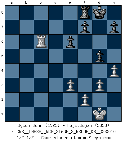 Last move : 1/2-1/2 2013 May 6 6:2:57 [Event "FICGS__CHESS__WCH_STAGE_2_GROUP_03__000010"] [Site "FICGS"] [Date "2012.12.03"] [Round "1"] [White "Dyson,John"] [Black "Fajs,Bojan"] [Result "1/2-1/2"] [WhiteElo "1923"] [BlackElo "2358"] 1.d4 Nf6 2.c4 e6 3.g3 d5 4.Nf3 dxc4 5.Bg2 a6 6.Ne5 Bb4+ 7.Nc3 Nd5 8.Bd2 Nb6 9.e3 N8d7 10.Nxd7 Qxd7 11.Ne4 a5 12.O-O O-O 13.a3 Be7 14.Nc5 Bxc5 15.dxc5 Na4 16.c6 bxc6 17.Qxa4 Qxd2 18.Rfd1 Qe2 19.Rac1 Rb8 20.Qxc4 Rxb2 21.Qxe2 Rxe2 22.Rc5 a4 23.Bxc6 Ra2 24.Rd4 Rxa3 25.Rxa4 Rxa4 26.Bxa4 Bb7 27.Rxc7 Bf3 28.Bc6 Bxc6 29.Rxc6 g5 30.h4 1/2-1/2 Catalan Opening Kingside Castling by player White (move 12) Kingside Castling by player Black (move 12) This chess game ended in a draw. Follow this game move after move (download)You know you're going to lose. Even when I was ahead I knew I was going to lose. - On playing against Fischer. (Andrew Soltis) In Buenos Aires ist es nicht mein vorrangiges Ziel ein starkes Turnier zu organisieren, sondern ein Turnier für Gentlemen. Ich würde nie Kamsky einladen. Ich mag keine Probleme. (Miguel Najdorf) El Ajedrez es 99 por ciento táctica. (Teichmann) Vous savez, camarade Pachman, je n'éprouve pas de plaisir à être ministre, je jouerais plutôt aux échecs comme vous, ou alors ferais une révolution au Venezuela. (Che Guevara à Ludek Pachman, 'Checkmate in Prague', 1975) To send light into the darkness of men's hearts - such is the duty of the artist. (Schumann)