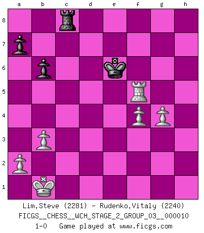 Last move : 1-0 2013 April 22 21:54:49 [Event "FICGS__CHESS__WCH_STAGE_2_GROUP_03__000010"] [Site "FICGS"] [Date "2012.12.03"] [Round "1"] [White "Lim,Steve"] [Black "Rudenko,Vitaly"] [Result "1-0"] [WhiteElo "2281"] [BlackElo "2240"] 1.d4 Nf6 2.c4 g6 3.Nc3 Bg7 4.e4 d6 5.Nf3 O-O 6.Be2 e5 7.Be3 Ng4 8.Bg5 f6 9.Bh4 Nd7 10.Qd2 g5 11.Bg3 Nh6 12.dxe5 Nxe5 13.O-O-O Be6 14.h4 Nxc4 15.Bxc4 Bxc4 16.hxg5 Nf7 17.Qc2 fxg5 18.e5 h6 19.Qe4 d5 20.Nxd5 Bxd5 21.Rxd5 Qe7 22.e6 Nd6 23.Bxd6 cxd6 24.Nxg5 Rf6 25.Rb5 Rc8+ 26.Kb1 b6 27.Qh7+ Kf8 28.Ne4 Rxe6 29.Rd5 Be5 30.Rxh6 Qxh7 31.Rxh7 Re7 32.Nxd6 Rc6 33.Rxe7 Kxe7 34.Rxe5+ Kxd6 35.Rf5 Rc7 36.g4 Ke6 37.f4 Rc8 38.b3 1-0 King's Indian : Gligoric-Taimanov system Kingside Castling by player Black (move 5) Queenside Castling by player White (move 13) 10 pieces endgame at move 34 : White KRPPPP , Black KRPP WHITE : King + 1 Rook 4 Pawns BLACK : King + 1 Rook 2 Pawns Player White won this chess game. Follow this game move after move (download)Without error there can be no brilliancy. (Emanuel Lasker) Ich hatte Angst gegen einen russischen Großmeister zu verlieren, und er befürchtete gegen einen kleinen Jungen zu verlieren. (über ein Remis gegen Juri Awerbach). (Robert James Fischer) El Ajedrez es realmente noventa y nueve por ciento calculación. (Soltis) Si le désir cupide (et stupide) de gagner est une inépuisable source de souffrance, une combinaison brillante sur l'échiquier est une découverte : le coquelicot qui s'épanouit lorsque apparaît la Voie Lactée. (Arrabal) Gambling : The sure way of getting nothing from something. (Wilson Mizner)