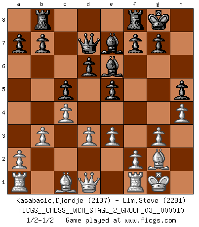 Last move : 1/2-1/2 2013 January 28 2:23:26 [Event "FICGS__CHESS__WCH_STAGE_2_GROUP_03__000010"] [Site "FICGS"] [Date "2012.12.03"] [Round "1"] [White "Kasabasic,Djordje"] [Black "Lim,Steve"] [Result "1/2-1/2"] [WhiteElo "2137"] [BlackElo "2281"] 1.Nf3 Nf6 2.c4 c5 3.Nc3 Nc6 4.g3 e5 5.Bg2 d6 6.d3 Be7 7.O-O O-O 8.Ne1 Be6 9.Nd5 Qd7 10.Nc2 Bd8 11.Nce3 h5 12.h4 Rb8 13.Nxf6+ Bxf6 14.Nd5 Bd8 15.e3 Ne7 16.Nxe7+ Bxe7 17.b3 1/2-1/2 Reti Opening Kingside Castling by player White (move 7) Kingside Castling by player Black (move 7) This chess game ended in a draw. Follow this game move after move (download)Those who say they understand Chess, understand nothing. (Robert Hubner) Ich bin stolz ein Bulgare zu sein. (Veselin Topalov) Vive, pierde y aprende al observar a tu oponente como gana. (Amber Steenbock) Aidez vos pièces, elles vous aideront. (Paul Morphy) A good aphorism is too hard for the tooth of time, and is not worn away with the centuries, although it serves as food for every speech. (Friedrich Nietzsche)