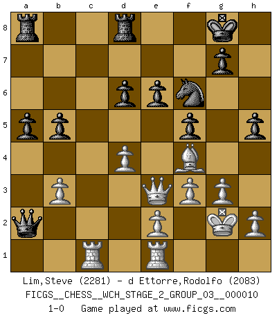 Last move : 1-0 2013 March 26 18:55:54 [Event "FICGS__CHESS__WCH_STAGE_2_GROUP_03__000010"] [Site "FICGS"] [Date "2012.12.03"] [Round "1"] [White "Lim,Steve"] [Black "d Ettorre,Rodolfo"] [Result "1-0"] [WhiteElo "2281"] [BlackElo "2083"] 1.d4 Nf6 2.c4 e6 3.Nf3 b6 4.g3 Bb7 5.Bg2 Be7 6.Nc3 Ne4 7.Bd2 Bf6 8.O-O O-O 9.Be1 Nxc3 10.Bxc3 Be4 11.Ne5 Bxg2 12.Kxg2 d6 13.Ng4 h5 14.Nxf6+ Qxf6 15.Rc1 Nd7 16.c5 Qf5 17.cxd6 cxd6 18.f3 Qd5 19.Qa4 b5 20.Qa3 f5 21.Rfe1 Nf6 22.Bd2 a5 23.Bf4 Rfd8 24.Qe3 Qxa2 25.b3 1-0 This chess game has been lost on time (started : 2012.12.03 13:32:17) Queen's Indian : Opovcensky variation Kingside Castling by player White (move 8) Kingside Castling by player Black (move 8) Player White won this chess game. Follow this game move after move (download)The chessboard is the world, the pieces are the phenomena of the Universe, the rules of the game are what we call the laws of Nature and the player on the other side is hidden from us. (Thomas Huxley) Modernes Schach sorgt sich zuviel um Dinge wie Bauernstruktur usw. Vergessen Sie das, Schachmatt beendet das Spiel! (Nigel Short) Cuando tengo las piezas blancas, yo gano porque soy blanco; Cuando tengo las piezas negras, yo gano porque soy Bogolyubov. (Bogolyubov) Le jeu d'échecs est comme rejeté hors du temps. (Antoine de Saint-Exupéry) For to win one hundred victories in one hundred battles is not the acme of skill. To subdue the enemy without fighting is the acme of skill. (Sun Tzu)