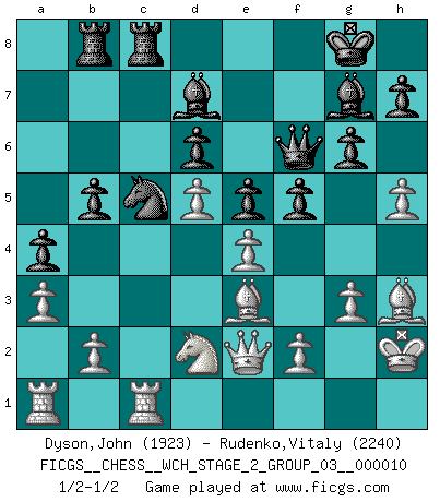 Last move : 1/2-1/2 2013 March 11 15:57:29 [Event "FICGS__CHESS__WCH_STAGE_2_GROUP_03__000010"] [Site "FICGS"] [Date "2012.12.03"] [Round "1"] [White "Dyson,John"] [Black "Rudenko,Vitaly"] [Result "1/2-1/2"] [WhiteElo "1923"] [BlackElo "2240"] 1.d4 Nf6 2.c4 g6 3.g3 Bg7 4.Bg2 O-O 5.Nc3 d6 6.Nf3 Nc6 7.O-O a6 8.Qd3 Bd7 9.d5 Nb4 10.Qd1 a5 11.a3 Na6 12.Be3 c6 13.Bd4 Re8 14.e4 e5 15.Be3 Qc7 16.Qb3 cxd5 17.Nxd5 Nxd5 18.cxd5 a4 19.Qd3 Nc5 20.Rfc1 Rec8 21.Qe2 b5 22.h4 Qd8 23.Nd2 f5 24.h5 Qf6 25.Kh2 Rab8 26.Bh3 1/2-1/2 King's Indian : 3.g3 Kingside Castling by player Black (move 4) Kingside Castling by player White (move 7) This chess game ended in a draw. Follow this game move after move (download)Up to this point White has been following well-known analysis. But now he makes a fatal error: he begins to use his own head. (Siegbert Tarrasch) Wenn Du nicht kämpfst, um anderen etwas zu beweisen, sondern nur für Dich selbst, dann bist du fast unbesiegbar. (Garry Kasparov) El pensamiento metódico es mas útil en el Ajedrez que la inspiración. (C. J. S. Purdy) Lorsque vous vous retrouvez devant une position atroce, ne tendez pas un ultime piège dérisoire avec l'intention d'abandonner si l'adversaire le déjoue ! Faites-vous plutôt un devoir de résister comme si votre vie en dépendait. Jouez le coup qui vous déplairait au centuple si vous étiez dans la peau de votre tortionnaire ! Is not life a hundred times too short to bore ourselves ? (Friedrich Nietzsche)