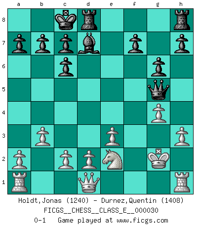 Last move : 0-1 2007 May 5 19:56:47 [Event "FICGS__CHESS__CLASS_E__000030"] [Site "FICGS"] [Date "2007.01.19"] [Round "1"] [White "Holdt,Jonas"] [Black "Durnez,Quentin"] [Result "0-1"] [WhiteElo "1240"] [BlackElo "1408"] 1.b3 e5 2.Bb2 Nc6 3.e3 g6 4.Bb5 Bg7 5.f4 Qe7 6.Nf3 Nf6 7.fxe5 Ng4 8.Bxc6 dxc6 9.h3 Nxe5 10.Nxe5 Bxe5 11.Bxe5 Qxe5 12.Nc3 Qg3+ 13.Kf1 Bf5 14.Ne2 Qg5 15.g4 Bd7 16.Kg2 O-O-O 0-1 This chess game has been lost on time (started : 2007.01.19 15:39:18) Nimzovich-Larsen attack : Modern variation Queenside Castling by player Black (move 16) Player Black won this chess game. Follow this game move after move (download)I look one move ahead... the best ! (Siegbert Tarrasch) Ich möchte Schüler heranbilden, die das Vermögen haben, selbst zu denken und Kritik zu üben. (Emanuel Lasker) De todos mis libros Rusos, la defensa contiene y difunde el 'calor' mas grande que pudiese verse extraño al observar lo supremamente abstracto que el Ajedrez supuestamente es. (Vladimir Nabokov) Roi des jeux et jeu des rois, les échecs portent en eux un sentiment d'infini. Ils donnent à celui qui s'est efforcé d'en approfondir les arcanes l'impression de n'être pas à la mesure de l'homme; en fait, ils constituent un résumé de l'univers, un microcosme, et figurent cette grande échelle qui, dans les plans de la lumière descend jusqu'à la matière, qui des abîmes insondables remonte jusqu'en l'infini de Dieu. (Pyrame) However beautiful the strategy, you should occasionally look at the results. (Winston Churchill)