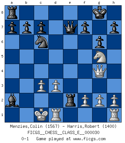 Last move : 0-1 2007 February 18 20:51:6 [Event "FICGS__CHESS__CLASS_E__000030"] [Site "FICGS"] [Date "2007.01.19"] [Round "1"] [White "Menzies,Colin"] [Black "Harris,Robert"] [Result "0-1"] [WhiteElo "1567"] [BlackElo "1400"] 1.c4 Nf6 2.Nc3 e6 3.d3 d5 4.cxd5 exd5 5.Bg5 Be7 6.e4 dxe4 7.Bxf6 Bxf6 8.Qa4+ Nc6 9.Qxe4+ Be6 10.O-O-O O-O 11.Nf3 Bxc3 12.bxc3 Bxa2 13.Be2 Re8 14.Qf5 Rxe2 15.Ng5 g6 16.Qg4 Qe7 0-1 English Opening Queenside Castling by player White (move 10) Kingside Castling by player Black (move 10) Player Black won this chess game. Follow this game move after move (download)The older I grow, the more I value Pawns. (Keres) Die starken Figuren des Gegners muss man abtauschen. (José Raúl Capablanca) ¿Esta Bobby Fischer algo cuerdo?. (Salo Flohr) Vous n'êtes pas toujours obligé de jouer le meilleur coup. Un coup doit être actif, entreprenant, correct et beau ! (David Bronstein) Opportunities multiply as they are seized. (Sun Tzu)