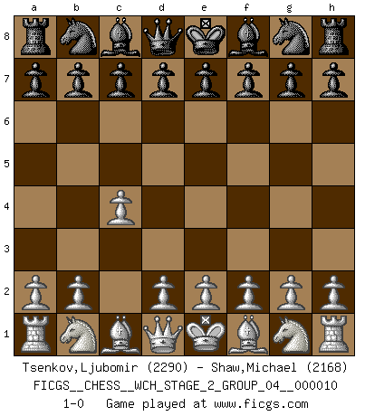 Last move : 1-0 2013 January 10 0:7:51 [Event "FICGS__CHESS__WCH_STAGE_2_GROUP_04__000010"] [Site "FICGS"] [Date "2012.12.03"] [Round "1"] [White "Tsenkov,Ljubomir"] [Black "Shaw,Michael"] [Result "1-0"] [WhiteElo "2290"] [BlackElo "2168"] 1.c4 1-0 This chess game has been lost on time (started : 2012.12.03 13:32:18) English Opening Player White won this chess game. Follow this game move after move (download)The only thing Chess players have in common is Chess. (Lodewijk Prins) Ivan Sokolov treibt mich als Beifahrer an mit go Loeky go - . (Loek van Wely) Repentinamente, me resultaba obvio en mi analisis que yo había pasado por alto lo que Fischer había visto en el tablero con la mas grande facilidad. (Mikhail Botvinnik) Je ne suis pas le dernier à jouer lâchement des coups douteux pendant le zeïtnot de l'adversaire pour l'achever: en effet les coups qui font le plus peur sont ceux que l'on ne comprend pas. Je me fais souvent peur quand je joue. (Un professeur anonyme) A shortcut is the longest distance between two points. (Don Groves)