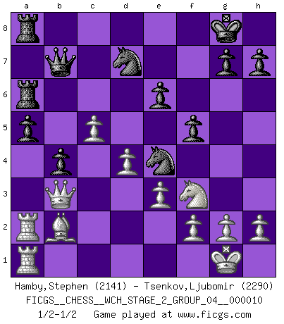 Last move : 1/2-1/2 2013 March 15 8:38:5 [Event "FICGS__CHESS__WCH_STAGE_2_GROUP_04__000010"] [Site "FICGS"] [Date "2012.12.03"] [Round "1"] [White "Hamby,Stephen"] [Black "Tsenkov,Ljubomir"] [Result "1/2-1/2"] [WhiteElo "2141"] [BlackElo "2290"] 1.c4 e6 2.d4 d5 3.Nf3 c6 4.Nc3 dxc4 5.a4 Bb4 6.e3 b5 7.Bd2 a5 8.axb5 Bxc3 9.Bxc3 cxb5 10.b3 Bb7 11.bxc4 b4 12.Bb2 Nf6 13.Bd3 O-O 14.O-O Nbd7 15.Re1 Be4 16.Bxe4 Nxe4 17.Qc2 f5 18.c5 Qc7 19.Ra2 Qb7 20.Qb3 Ra6 21.Rea1 Rfa8 1/2-1/2 English Opening Kingside Castling by player Black (move 13) Kingside Castling by player White (move 14) This chess game ended in a draw. Follow this game move after move (download)Of Chess it has been said that life is not long enough for it, but that is the fault of life, not Chess. (William Ewart Napier) Ich kenne Menschen, die allen Willen der Welt besitzen und doch nicht Schach spielen können. (Robert James Fischer) El jugador de combinación piensa hacia adelante; comienza de la posición dada y trabaja las movidas contundentes en su mente. (Emanuel Lasker) Le succès, c'est être capable d'aller d'échec en échec sans perdre son enthousiasme. (Winston Churchill) Good decisions come from experience, and experience comes from bad decisions. (Anonymous)