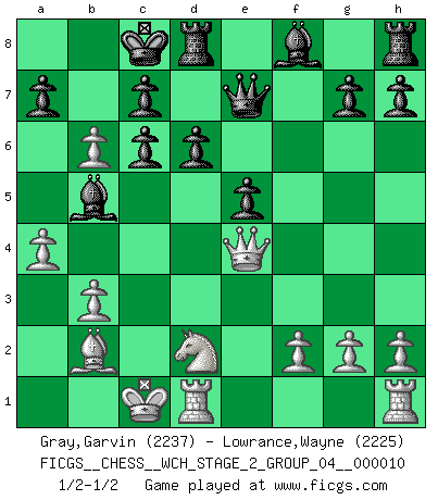 Last move : 1/2-1/2 2013 February 27 17:30:51 [Event "FICGS__CHESS__WCH_STAGE_2_GROUP_04__000010"] [Site "FICGS"] [Date "2012.12.03"] [Round "1"] [White "Gray,Garvin"] [Black "Lowrance,Wayne"] [Result "1/2-1/2"] [WhiteElo "2237"] [BlackElo "2225"] 1.e4 e5 2.Nf3 Nc6 3.d4 exd4 4.Nxd4 Nf6 5.Nxc6 bxc6 6.e5 Qe7 7.Qe2 Nd5 8.c4 Ba6 9.Nd2 O-O-O 10.b3 f6 11.Qe4 Nb6 12.Bb2 fxe5 13.O-O-O d6 14.c5 Bxf1 15.cxb6 Bb5 16.a4 1/2-1/2 Scotch : Mieses variation Queenside Castling by player Black (move 9) Queenside Castling by player White (move 13) This chess game ended in a draw. Follow this game move after move (download)Let the perfectionist play postal. (Yasser Seirawan) Wenn Capablanka heute auf der Schachbühne erscheinen würde, hätte er ein halbes Jahr gebraucht um sich die Schachtheorie anzueignen. Und dann hätte er alles und jeden besiegt. (Mikhail Moiseyevich Botvinik) En el Ajedrez, cuando menos, el valiente hereda la tierra. (Edmar Mednis) Roi des jeux et jeu des rois, les échecs portent en eux un sentiment d'infini. Ils donnent à celui qui s'est efforcé d'en approfondir les arcanes l'impression de n'être pas à la mesure de l'homme; en fait, ils constituent un résumé de l'univers, un microcosme, et figurent cette grande échelle qui, dans les plans de la lumière descend jusqu'à la matière, qui des abîmes insondables remonte jusqu'en l'infini de Dieu. (Pyrame) Even the best needles are not sharp at both ends. (Chinese proverb)