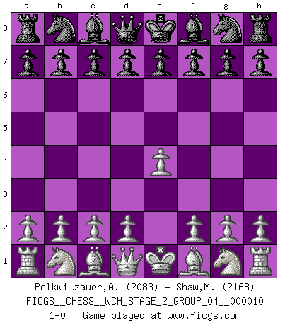 Last move : 1-0 2013 January 10 0:7:51 [Event "FICGS__CHESS__WCH_STAGE_2_GROUP_04__000010"] [Site "FICGS"] [Date "2012.12.03"] [Round "1"] [White "Polkwitzauer,Ardiantez"] [Black "Shaw,Michael"] [Result "1-0"] [WhiteElo "2083"] [BlackElo "2168"] 1.e4 1-0 This chess game has been lost on time (started : 2012.12.03 13:32:18) King's pawn Opening Player White won this chess game. Follow this game move after move (download)There are two types of sacrifices: correct ones and mine. (Mikhail Tal) Im Schach nämlich geht es darum, daß Ich des Gegners klein zu kriegen, sein Ego zu zerbrechen und zu zermahlen, seine Selbstachtung zu zertreten und zu verscharren und seine ganze mißachtenswerte sogenannte Persönlichkeit ein für alle Mal tot zu hacken und zu zerstampfen und dadurch die menschliche Gesellschaft von einer stinkenden Pestbeule zu befreien. Es ist ein königliches Spiel. (Robert James Fischer) Hoy en día, si tu no eres un Gran Maestro a los 14 años, es mejor que lo olvides. (Anand Viswanathan) La vérité est comme le meilleur coup aux échecs : elle existe, mais il faut la chercher. (Arturo Perez-Reverte) For to win one hundred victories in one hundred battles is not the acme of skill. To subdue the enemy without fighting is the acme of skill. (Sun Tzu)
