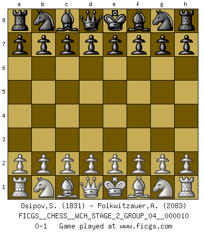Last move : 0-1 2013 January 10 0:7:51 [Event "FICGS__CHESS__WCH_STAGE_2_GROUP_04__000010"] [Site "FICGS"] [Date "2012.12.03"] [Round "1"] [White "Osipov,Sergey"] [Black "Polkwitzauer,Ardiantez"] [Result "0-1"] [WhiteElo "1831"] [BlackElo "2083"] 0-1 This chess game has been lost on time (started : 2012.12.03 13:32:18) Player Black won this chess game. Follow this game move after move (download)Fischer Chess play was always razor-sharp, rational and brilliant. One of the best ever. (Dave Regis) Es gibt keine einzige Frau, der ich nicht einen Springer vorgeben könnte und trotzdem gewänne. (Robert James Fischer) El juego de Damas es para vagabundos. (Paul Morphy) J'apprécie les joueurs d'est-indienne, c'est grâce à eux que je nourris ma famille depuis tant d'années. (Petrosian) I just play for fun. (Anna Kournikova)