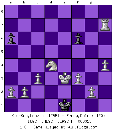 Last move : 1-0 2007 April 4 3:14:48 [Event "FICGS__CHESS__CLASS_F__000025"] [Site "FICGS"] [Date "2007.01.19"] [Round "1"] [White "Kis-Kos,Laszlo"] [Black "Percy,Dale"] [Result "1-0"] [WhiteElo "1265"] [BlackElo "1120"] 1.e4 Nf6 2.e5 Ne4 3.d3 Nc5 4.d4 Ne4 5.f3 Nf2 6.Kxf2 e6 7.Be2 b6 8.Nc3 Nc6 9.Nh3 Qh4+ 10.Kg1 Be7 11.Nb5 a6 12.Nxc7+ Kd8 13.Nxa8 Nxd4 14.Nxb6 Nxe2+ 15.Qxe2 Bc5+ 16.Be3 Qb4 17.Bxc5 Qxc5+ 18.Qf2 Qc6 19.Nxc8 Kxc8 20.Qe3 Qb5 21.Qc3+ Kb7 22.Qb3 Kb6 23.Qxb5+ Kxb5 24.Kf2 Rc8 25.c3 Kc4 26.Rhd1 f6 27.Rxd7 Rc5 28.exf6 gxf6 29.Rxh7 Kd3 30.Nf4+ Kd2 31.Nxe6 Re5 32.Nd4 Re3 33.Rd1+ Kxd1 34.Kxe3 Ke1 35.h4 1-0 Alekhine's defense : Mokele Mbembe (Buecker) variation Player White won this chess game. Follow this game move after move (download)In complicated positions, Bobby Fischer hardly had to be afraid of anybody. (Paul Keres) Kritik überlasse ich den Spießern. Ich zeige nichts, wofür ich mich schämen muss. (Alexandra Kosteniuk) El Peón aislado arroja penumbra sobre todo el tablero. (Aaron Nimzovich) Aux échecs, les retours au sommet sont rares : les dommages psychologiques consécutifs à une défaite sont trop sévères. (Daily Telegraph) Every man's memory is his private literature. (Aldous Huxley)
