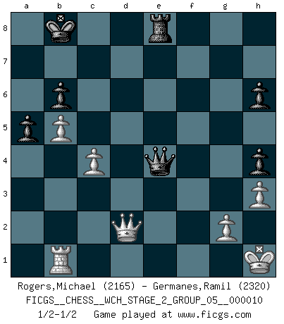Last move : 1/2-1/2 2013 January 5 14:28:45 [Event "FICGS__CHESS__WCH_STAGE_2_GROUP_05__000010"] [Site "FICGS"] [Date "2012.12.03"] [Round "1"] [White "Rogers,Michael"] [Black "Germanes,Ramil"] [Result "1/2-1/2"] [WhiteElo "2165"] [BlackElo "2320"] 1.e4 c5 2.Nf3 d6 3.d4 cxd4 4.Nxd4 Nf6 5.Nc3 a6 6.Bg5 e6 7.f4 Qb6 8.Qd2 Qxb2 9.Rb1 Qa3 10.e5 h6 11.Bh4 dxe5 12.fxe5 g5 13.exf6 gxh4 14.Be2 Qa5 15.O-O Nd7 16.Kh1 Qg5 17.Rf4 e5 18.Nd5 exd4 19.Qxd4 Kd8 20.Ne7 Qe5 21.Qd2 Bxe7 22.fxe7+ Qxe7 23.Bg4 f5 24.Rxf5 Re8 25.Rd5 b6 26.h3 Kc7 27.Bxd7 Bxd7 28.Qf4+ Kb7 29.Qd4 Bb5 30.a4 Rad8 31.axb5 a5 32.c4 Rxd5 33.Qxd5+ Kb8 34.Qd2 Qe4 1/2-1/2 Sicilian : Najdorf, 7...Qb6 Kingside Castling by player White (move 15) This chess game ended in a draw. Follow this game move after move (download)If a ruler does not understand Chess, how can he rule over a kingdom ? (King Khusros II) Ein Remis kann durch Wiederholung von drei Zügen oder durch einen schlechte Zug erreicht werden. (Savielly Grigorievitsch Tartakower) Aquel que toma al Peón de Caballo de la Reina, se pasará la noche a dormir en la calle. (Anónimo) Les échecs c'est le défi de l'alpiniste, toujours plus haut, prêt à tout pour monter à l'assaut du Roi ennemi. Les échecs, c'est de la musique en mouvement, un ballet majestueux pour les yeux. C'est de la poésie composée par les fantômes du passé qui au même titre que Rimbaud ou Verlaine méritent notre admiration. Les échecs, c'est de la peinture ou le moindre mouvement modifie le tableau pour en faire un Picasso ou un Van Gogh. Les échecs, c'est tout et rien, c'est la vie et la mort. Jjulie33 sur le forum de France-Echecs. Memory is a complicated thing, a relative to truth, but not its twin. (Barbara Kingsolver, Animal Dreams)