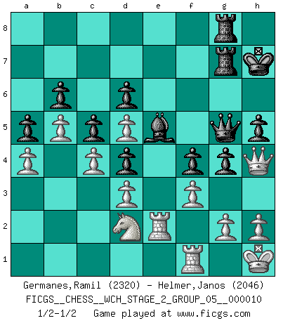 Last move : 1/2-1/2 2013 May 21 13:19:10 [Event "FICGS__CHESS__WCH_STAGE_2_GROUP_05__000010"] [Site "FICGS"] [Date "2012.12.03"] [Round "1"] [White "Germanes,Ramil"] [Black "Helmer,Janos"] [Result "1/2-1/2"] [WhiteElo "2320"] [BlackElo "2046"] 1.e4 c5 2.Nf3 Nc6 3.Bb5 g6 4.O-O Bg7 5.Nc3 d6 6.Re1 e5 7.d3 Nge7 8.Bg5 f6 9.Be3 Be6 10.Bc4 Qd7 11.Bxe6 Qxe6 12.Nb5 Rc8 13.c4 O-O 14.a3 f5 15.b4 b6 16.Rb1 h6 17.Nc3 Qd7 18.b5 Nd4 19.Nd2 Ne6 20.f3 f4 21.Bf2 Ra8 22.a4 Rfb8 23.Ra1 a6 24.Qb3 a5 25.Nd5 Kh7 26.Qb2 Ng8 27.Rac1 Rb7 28.Kh1 Rf8 29.Rg1 Bf6 30.Rge1 g5 31.Nb1 h5 32.Qe2 Nd4 33.Qa2 Qg7 34.Bxd4 exd4 35.Qf2 Be5 36.Re2 Qh6 37.Nd2 Nf6 38.Rf1 Rg8 39.R2e1 g4 40.Qh4 Nxd5 41.exd5 Rbg7 42.Re2 Qg5 1/2-1/2 Sicilian : Nimzovich-Rossolimo attack (with ...g6, without ...d6) Kingside Castling by player White (move 4) Kingside Castling by player Black (move 13) This chess game ended in a draw. Follow this game move after move (download)Half the variations which are calculated in a tournament game turn out to be completely superfluous. Unfortunately, no one knows in advance which half. (Jan Tinman) Drei Punkte vor allen anderen ist wie einer, der im weißen Anzug posiert, während der Rest in Müllsäcke gekleidet dasteht. (Viktor Kortschnoi) Hoy en día, si tu no eres un Gran Maestro a los 14 años, es mejor que lo olvides. (Anand Viswanathan) Le pion, dans sa simplicité, marche droit devant lui, mais lorsqu'il prend, il le fait obliquement? Ainsi l'homme, tant qu'il reste pauvre, marche dans la droiture et vit honnêtement, mais lorsqu'il recherche les honneurs, il flatte, se parjure et, par les voies obliques, cherche une position supérieure sur l'échiquier du monde. (Jean de Galles) Art is the triumph over chaos. (John Cheever)