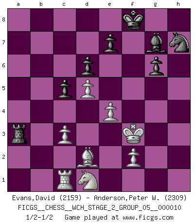 Last move : 1/2-1/2 2013 March 12 15:7:39 [Event "FICGS__CHESS__WCH_STAGE_2_GROUP_05__000010"] [Site "FICGS"] [Date "2012.12.03"] [Round "1"] [White "Evans,David"] [Black "Anderson,Peter W."] [Result "1/2-1/2"] [WhiteElo "2159"] [BlackElo "2309"] 1.e4 g6 2.d4 Bg7 3.Nc3 d6 4.Nf3 Nf6 5.Be2 O-O 6.O-O c6 7.a4 Nbd7 8.h3 Qc7 9.Be3 b6 10.Qd2 a6 11.g4 Bb7 12.g5 Ne8 13.h4 b5 14.axb5 axb5 15.Rxa8 Bxa8 16.Ra1 Bb7 17.h5 b4 18.Na4 c5 19.hxg6 hxg6 20.d5 Qc8 21.c4 bxc3 22.bxc3 Ba6 23.Bxa6 Qxa6 24.Qd1 Qc8 25.Kg2 Nc7 26.Nd2 Qb7 27.Qb1 Rb8 28.Qxb7 Rxb7 29.Rc1 Ra7 30.Nb2 Nb5 31.Nd1 Ra2 32.Nc4 Kf8 33.Kg3 f6 34.gxf6 Nxf6 35.Kf3 Na3 36.Nxa3 Rxa3 37.Bg5 Nh7 38.Bd2 1/2-1/2 Robatsch defense : Two knights variation Kingside Castling by player Black (move 5) Kingside Castling by player White (move 6) This chess game ended in a draw. Follow this game move after move (download)The hallmark of the artist is simplicity. (Larry Evans) Kostenjuk hat keinen Sexappeal. (Loek van Wely) El ganar no lo es todo... pero el perder es nada. (Mednis) La vérité est comme le meilleur coup aux échecs : elle existe, mais il faut la chercher. (Arturo Perez-Reverte) Creativity is allowing yourself to make mistakes. Art is knowing which ones to keep. (Scott Adams)