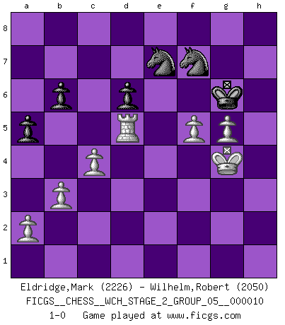 Last move : 1-0 2013 May 12 7:57:0 [Event "FICGS__CHESS__WCH_STAGE_2_GROUP_05__000010"] [Site "FICGS"] [Date "2012.12.03"] [Round "1"] [White "Eldridge,Mark"] [Black "Wilhelm,Robert"] [Result "1-0"] [WhiteElo "2226"] [BlackElo "2050"] 1.c4 b6 2.g3 Bb7 3.Nf3 Bxf3 4.exf3 c5 5.d4 cxd4 6.Qxd4 Nc6 7.Qd3 Rc8 8.Nc3 e6 9.f4 Nb4 10.Qe2 Qc7 11.b3 Qb7 12.Rg1 Nf6 13.Bg2 Qb8 14.Bb2 Be7 15.Kf1 O-O 16.Bf3 Rfd8 17.Kg2 Ne8 18.Rgd1 Bf6 19.Nb5 Bxb2 20.Qxb2 a6 21.Nd4 Qc7 22.Rac1 g6 23.Qe2 a5 24.Rd2 Nc6 25.Nb5 Qb8 26.Rcd1 d6 27.Rd3 Rd7 28.h4 Ne7 29.h5 Rcd8 30.Nd4 Qc8 31.hxg6 hxg6 32.f5 gxf5 33.Nxe6 fxe6 34.Qxe6+ Kg7 35.Bh5 Ng8 36.Qxf5 Nef6 37.Rf3 Qc6 38.Qg5+ Kh8 39.Bg6 Rf8 40.Rd5 Rh7 41.Bxh7 Nxh7 42.Qe3 Rxf3 43.Qxf3 Ne7 44.Rd1 Qxf3+ 45.Kxf3 Ng5+ 46.Ke3 Nf7 47.f4 Kg7 48.g4 Kf6 49.Kf3 Nc6 50.g5+ Kf5 51.Rd5+ Kg6 52.Kg4 Ne7 53.f5+ 1-0 English Opening Kingside Castling by player Black (move 15) Player White won this chess game. Follow this game move after move (download)I love all positions. Give me a difficult positional game, I will play it. But totally won positions, I cannot stand them. (Hein Donner) Es macht mich traurig, wenn ich sehe, dass Golfprofis mehr verdienen als Schachsportler. Obwohl ich davon überzeugt bin, dass wir Schachspieler viel härter trainieren müssen als die Golfer. (Alexandra Kosteniuk) El sobresalir en el Ajedrez es un signo de una mente intrigante. (Sir Arthur Conan Doyle) D'abord les bases : Jouez et étudiez, puis étudiez et jouez, ensuite jouez et étudiez, puis étudiez et jouez. Deuxièmement : Donnez toujours le meilleur de vous-même ! (Ken Smith) When you don't know what to do, walk fast and look worried. (Anonymous)