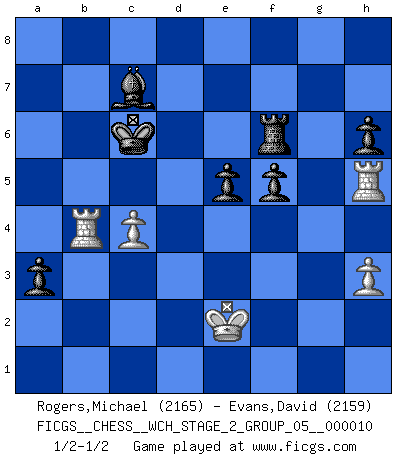 Last move : 1/2-1/2 2013 March 8 15:9:48 [Event "FICGS__CHESS__WCH_STAGE_2_GROUP_05__000010"] [Site "FICGS"] [Date "2012.12.03"] [Round "1"] [White "Rogers,Michael"] [Black "Evans,David"] [Result "1/2-1/2"] [WhiteElo "2165"] [BlackElo "2159"] 1.e4 c5 2.Nf3 d6 3.d4 cxd4 4.Nxd4 Nf6 5.Nc3 a6 6.Bg5 Nbd7 7.f4 Qb6 8.Qd2 e5 9.Nf5 Qxb2 10.Rb1 Qa3 11.Rb3 Qc5 12.Be2 b5 13.fxe5 dxe5 14.Nd5 Nxe4 15.Qa5 f6 16.Nc7+ Kf7 17.Be3 Qc6 18.Nxa8 Ndc5 19.Bxc5 Bxc5 20.Qc7+ Qxc7 21.Nxc7 Bf2+ 22.Kf1 Bxf5 23.g4 Bc8 24.Bf3 Bb6 25.Bxe4 Bxc7 26.h3 Ke7 27.Ke2 Bb6 28.Bf5 g6 29.Bxc8 Rxc8 30.c3 Rc6 31.Ra1 f5 32.a4 bxa4 33.Rxa4 a5 34.Rb5 Bc7 35.gxf5 gxf5 36.Rh4 h6 37.Rh5 Rf6 38.Rb7 Kd7 39.c4 Kc6 40.Rb5 a4 41.Rb4 a3 1/2-1/2 Sicilian : Najdorf, 6.Bg5 This chess game ended in a draw. Follow this game move after move (download)By this measure (on the gap between Fischer & his contemporaries), I consider him the greatest world champion. (Garry Kasparov) Das Schachspiel ist ein See, in welchem eine Mücke baden und ein Elefant ertrinken kann. (Emanuel Lasker) Observen a Garry Kasparov. Después de una derrota, invariablemente el gana la próxima partida. Prácticamente hace pedazos a su siguiente oponente. Eso es algo que tenemos que aprender a lograr. (Maurice Ashley) Pour moi, les échecs ne sont pas un jeu mais un art. (Alexandre Alekhine) He is a liar. I just don't know what the lie is yet. (Horatio Caine, C.S.I. Miami)