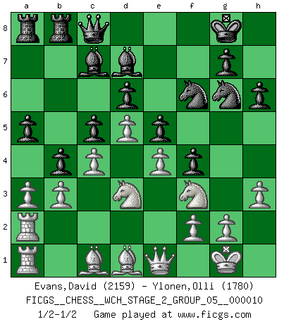 Last move : 1/2-1/2 2013 April 29 19:47:55 [Event "FICGS__CHESS__WCH_STAGE_2_GROUP_05__000010"] [Site "FICGS"] [Date "2012.12.03"] [Round "1"] [White "Evans,David"] [Black "Ylonen,Olli"] [Result "1/2-1/2"] [WhiteElo "2159"] [BlackElo "1780"] 1.e4 e5 2.Nf3 Nc6 3.Bb5 a6 4.Ba4 Nf6 5.O-O Be7 6.Re1 b5 7.Bb3 d6 8.c3 O-O 9.h3 Nb8 10.d4 Nbd7 11.c4 c6 12.Nc3 b4 13.Na4 c5 14.d5 Re8 15.Bc2 Nf8 16.a3 a5 17.b3 Ng6 18.Nb2 Bd7 19.Nd3 h6 20.Ra2 Qc8 21.Qe2 Bd8 22.Bd2 Be7 23.Nh2 Nh7 24.Nf3 Qb7 25.Rea1 Nf6 26.Bd1 Nh7 27.Bc1 Reb8 28.Qe1 Qc8 29.Be3 Nf6 30.Bc1 Nh7 31.Bd2 Bd8 32.Nh2 f5 33.Nf1 f4 34.Nh2 Nf6 35.Nf3 Bc7 36.Bc1 1/2-1/2 Ruy Lopez : Closed Kingside Castling by player White (move 5) Kingside Castling by player Black (move 8) This chess game ended in a draw. Follow this game move after move (download)All I want to do, ever, is just play Chess. (Bobby Fischer) Wie, soll nun auch die Opposition abgeschafft werden? Ja, es tut mir leid, Ihnen diesen Schmerz nicht ersparen zu können. (Aaron Nimzowitsch) El Ajedrez es un cuento de Hadas de las 1001 metidas de pata. (Savielly Tartakower) J'ai vu le vaincu d'Echecs jouer des années durant dans l'espoir de la fête de la victoire. Car tu es plus riche de ce qu'elle existe si même elle n'est point pour toi. Ainsi de la perle du fond des mers. (Antoine de Saint-Exupéry) The question of whether computers can think is just like question of whether submarines can swim. (Edsger W. Dijkstra)