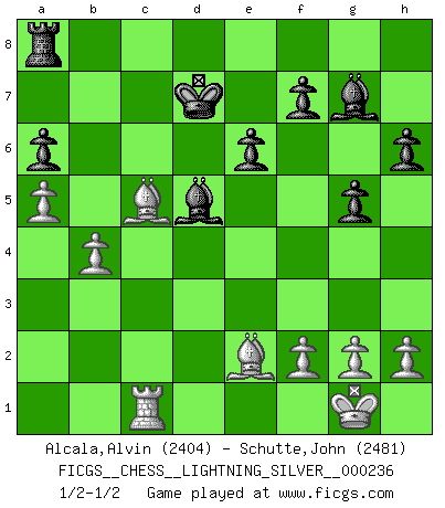 Last move : 1/2-1/2 2012 December 4 17:2:16 [Event "FICGS__CHESS__LIGHTNING_SILVER__000236"] [Site "FICGS"] [Date "2012.12.04"] [Round "1"] [White "Alcala,Alvin"] [Black "Schutte,John"] [Result "1/2-1/2"] [WhiteElo "2404"] [BlackElo "2481"] 1.d4 d5 2.c4 c6 3.Nc3 Nf6 4.Nf3 e6 5.Bg5 h6 6.Bh4 dxc4 7.e4 g5 8.Bg3 b5 9.Be2 Bb7 10.O-O Nbd7 11.Ne5 Bg7 12.Nxd7 Nxd7 13.Bd6 a6 14.a4 b4 15.Bxb4 Qb6 16.Ba3 Qxd4 17.a5 Qxd1 18.Rfxd1 c5 19.Bxc4 Ke7 20.Na4 Rhc8 21.Rac1 Ke8 22.Rxd7 Kxd7 23.Nxc5+ Rxc5 24.Bxc5 Bxe4 25.b4 Bd5 26.Be2 1/2-1/2 QGD Slav defense Kingside Castling by player White (move 10) This chess game ended in a draw. Follow this game move after move (download)Nothing excites jaded Grandmasters more than a theoretical novelty. (Dominic Lawson) Der Vorposten provoziert a) eine Basis für neue Angriffe und b) eine Schwächung der gegnerischen Widerstandskraft in der fraglichen Linie. (Aaron Nimzowitsch) Cuando estes solo, cuando te sientas un extraño en el mundo, juega al Ajedrez. Esto levantará tu espiritu y será tu consejero de guerra. (Aristóteles) On est toujours la mazette de quelqu'un d'autre. (Anonyme) Always two there are. No more no less. A master, and an apprentice. (Master Yoda in Star Wars ep.1)