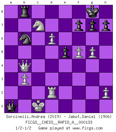 Last move : 1/2-1/2 2013 March 17 19:12:17 [Event "FICGS__CHESS__RAPID_A__000133"] [Site "FICGS"] [Date "2012.12.05"] [Round "1"] [White "Sorcinelli,Andrea"] [Black "Jabot,Daniel"] [Result "1/2-1/2"] [WhiteElo "2019"] [BlackElo "1906"] 1.e4 c5 2.Nf3 d6 3.d4 cxd4 4.Nxd4 Nf6 5.Nc3 a6 6.f3 e5 7.Nb3 Be7 8.Be3 Be6 9.Qd2 O-O 10.O-O-O b5 11.g4 Nbd7 12.g5 b4 13.Ne2 Ne8 14.f4 a5 15.f5 Bxb3 16.cxb3 a4 17.bxa4 Rxa4 18.b3 Ra5 19.Kb1 d5 20.exd5 Bc5 21.Bxc5 Nxc5 22.Qxb4 Qa8 23.Nc3 Nd6 24.Bb5 Rc8 25.Rd2 Nxb5 26.Nxb5 Qa6 27.a4 Nxa4 28.Rc1 Rb8 29.d6 Nb6 30.Nc7 Ra1+ 31.Kc2 Rxc1+ 32.Kxc1 Qa1+ 1/2-1/2 Sicilian : Najdorf Kingside Castling by player Black (move 9) Queenside Castling by player White (move 10) This chess game ended in a draw. Follow this game move after move (download)In blitz, the Knight is stronger than the Bishop. (Vlastimil Hort) Ich glaube nicht an Psychologie, ich glaube an gute Züge. (Robert James Fischer) Cuando no sepas que mover, espera por una idea que se le venga a la la cabeza de tu oponente. Tenlo por seguro de que esa idea estará incorrecta. (Siegbert Tarrasch) Le moment que je préfère le plus dans une rencontre, c'est celui où je sens que la personnalité de l'adversaire se brise. (Robert Fischer) Plans are ideas that never come to fruition. (Daniel Parmet)