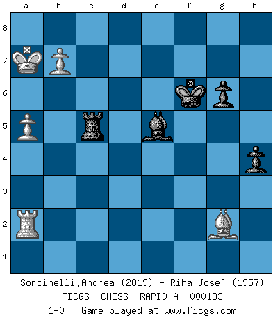 Last move : 1-0 2013 March 2 12:38:4 [Event "FICGS__CHESS__RAPID_A__000133"] [Site "FICGS"] [Date "2012.12.05"] [Round "1"] [White "Sorcinelli,Andrea"] [Black "Riha,Josef"] [Result "1-0"] [WhiteElo "2019"] [BlackElo "1957"] 1.e4 c5 2.Nf3 d6 3.d4 cxd4 4.Nxd4 Nf6 5.Nc3 a6 6.Be3 e5 7.Nb3 Be6 8.f3 Be7 9.Qd2 O-O 10.O-O-O Nbd7 11.g4 Qc7 12.Kb1 Rfc8 13.g5 Nh5 14.Nd5 Bxd5 15.exd5 Nb6 16.Na5 Nf4 17.Bxf4 exf4 18.Bh3 Re8 19.Qxf4 Bf8 20.Rd3 Re5 21.Rhd1 Rae8 22.a3 g6 23.Qb4 R8e7 24.c4 Re2 25.Bf1 Rf2 26.Ka2 Bg7 27.Rb3 Re3 28.R1d3 Rxd3 29.Bxd3 Bd4 30.h4 Rxf3 31.h5 Qe7 32.Nxb7 Qxb7 33.Qxd6 Qc8 34.Qc6 Qxc6 35.dxc6 Re3 36.hxg6 fxg6 37.c5 Bxc5 38.c7 Re8 39.Bxa6 Kf7 40.Rc3 Bd4 41.Rc2 Ke7 42.c8Q Nxc8 43.Bxc8 Be3 44.a4 Kd6 45.b4 Re7 46.a5 Rc7 47.Re2 Bxg5 48.Re6+ Kd5 49.Re8 Kc6 50.Ba6 Ra7 51.b5+ Kd6 52.Kb3 Re7 53.Rd8+ Rd7 54.Rf8 Rd8 55.Rf2 Be3 56.Re2 Re8 57.Kc4 Re5 58.Bb7 Rc5+ 59.Kb4 Bd4 60.Rd2 Ke5 61.b6 Rc1 62.Re2+ Kf6 63.Kb5 Rc5+ 64.Ka6 h5 65.Bg2 Bc3 66.Ra2 h4 67.b7 Be5 68.Ka7 1-0 Sicilian : Najdorf, Byrne (English) attack Kingside Castling by player Black (move 9) Queenside Castling by player White (move 10) Promotion Queen by player White (move 42) 10 pieces endgame at move 47 : White KRBPP , Black KRBPP WHITE : King + 1 Rook 1 Bishop 2 Pawns BLACK : King + 1 Rook 1 Bishop 2 Pawns Player White won this chess game. Follow this game move after move (download)Best by test: 1. e4 (Bobby Fischer) Dein Körper muss in Topform sein. Dein Schach verfällt, wenn dein Körper verfällt. Der Körper kann nicht vom Geist getrennt werden. (Robert James Fischer) Un juego de Ajedrez es un dialogo, una conversación entre un jugador y su oponente. Cada movimiento del oponente puede contener amenazas o tropiezos, pero un jugador no se puede defender de las amenazas o tomar ventaja de los tropiezos si es que no se pregunta a sí mismo: ¿Que es lo que mi oponente va a hacer después de cada movida?. (Bruce A. Moon) C'est la seule position que je connaisse où les deux camps sont mals. Propos prêtés à V. Anand. 98% of all statistics are made up. (Author unknown)