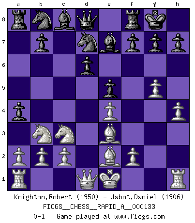 Last move : 0-1 2013 March 5 5:2:2 [Event "FICGS__CHESS__RAPID_A__000133"] [Site "FICGS"] [Date "2012.12.05"] [Round "1"] [White "Knighton,Robert"] [Black "Jabot,Daniel"] [Result "0-1"] [WhiteElo "1950"] [BlackElo "1906"] 1.e4 c5 2.Nf3 d6 3.d4 cxd4 4.Nxd4 Nf6 5.Nc3 a6 6.Be3 Ng4 7.Bc1 Nf6 8.Be2 e5 9.Nb3 Be7 10.Be3 O-O 11.g4 a5 12.g5 Nfd7 13.h4 a4 0-1 This chess game has been lost on time (started : 2012.12.05 16:17:27) Sicilian : Najdorf, Byrne (English) attack Kingside Castling by player Black (move 10) Player Black won this chess game. Follow this game move after move (download)There are two types of sacrifices: correct ones and mine. (Mikhail Tal) Das Schachspiel übertrifft alle anderen Spiele so weit wie der Chimborasso einen Misthaufen. (Arthur Schopenhauer) Todo lo que importa ante el tablero de Ajedrez son buenas jugadas. (Bobby Fischer) Je menace de comprendre la position. (Anonyme) The quality of decision is like the well-timed swoop of a falcon which enables it to strike and destroy its victim. (Sun Tzu)