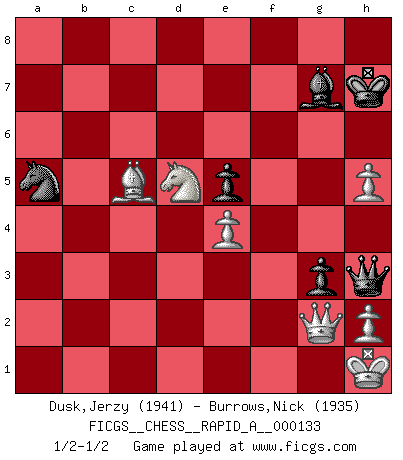 Last move : 1/2-1/2 2013 March 12 18:43:49 [Event "FICGS__CHESS__RAPID_A__000133"] [Site "FICGS"] [Date "2012.12.05"] [Round "1"] [White "Dusk,Jerzy"] [Black "Burrows,Nick"] [Result "1/2-1/2"] [WhiteElo "1941"] [BlackElo "1935"] 1.d4 Nf6 2.Nf3 g6 3.c4 Bg7 4.Nc3 O-O 5.e4 d6 6.Be2 e5 7.O-O Nc6 8.d5 Ne7 9.Ne1 Nd7 10.Be3 f5 11.f3 f4 12.Bf2 g5 13.a4 a5 14.Nd3 b6 15.b4 axb4 16.Nxb4 Nf6 17.Nd3 h5 18.Nb5 g4 19.Qd2 gxf3 20.Bxf3 Bg4 21.a5 bxa5 22.Rxa5 Qd7 23.Rxa8 Rxa8 24.Qe2 c6 25.dxc6 Nxc6 26.Rd1 Bf8 27.Kh1 Bxf3 28.gxf3 Kh7 29.Nc3 Qh3 30.Rg1 Ra3 31.Nd5 Ng4 32.fxg4 Rxd3 33.gxh5 Bg7 34.Rg6 Na5 35.c5 dxc5 36.Bxc5 Rg3 37.Rxg3 fxg3 38.Qg2 1/2-1/2 King's Indian : East Indian defense Kingside Castling by player Black (move 4) Kingside Castling by player White (move 7) This chess game ended in a draw. Follow this game move after move (download)The isolated Pawn casts gloom over the entire chessboard. (Aaron Nimzovich) Spielt Blackmar-Diemer-Gambit, und das Matt kommt von selbst! (Emil Joseph Diemer) Observen a Garry Kasparov. Después de una derrota, invariablemente el gana la próxima partida. Prácticamente hace pedazos a su siguiente oponente. Eso es algo que tenemos que aprender a lograr. (Maurice Ashley) Le plus grand jeu de l'esprit jamais inventé, plus vous l'apprenez, plus vous y prenez du plaisir. (Garry Kasparov) If you are good, you will be assigned all the work. If you are really good, you will get out of it. (Dan Rotaru)