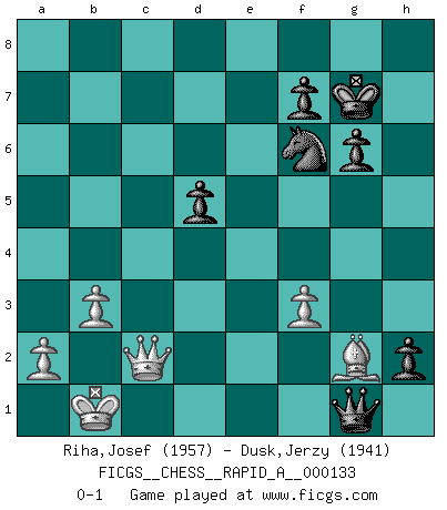 Last move : 0-1 2012 December 19 13:22:6 [Event "FICGS__CHESS__RAPID_A__000133"] [Site "FICGS"] [Date "2012.12.05"] [Round "1"] [White "Riha,Josef"] [Black "Dusk,Jerzy"] [Result "0-1"] [WhiteElo "1957"] [BlackElo "1941"] 1.d4 Nf6 2.c4 e6 3.Nc3 d5 4.cxd5 exd5 5.Bg5 c6 6.e3 Be7 7.Bd3 Nbd7 8.Nge2 O-O 9.Qc2 Re8 10.h3 Nf8 11.O-O-O a5 12.g4 b5 13.Ng3 h6 14.Bxf6 Bxf6 15.Kb1 a4 16.Nf5 Bxf5 17.gxf5 Qd6 18.Rd2 Rec8 19.Rc1 Nd7 20.R2d1 a3 21.b3 b4 22.Ne2 c5 23.Qd2 Rab8 24.Bc2 cxd4 25.Nxd4 Rc7 26.Rg1 Rbc8 27.Rgd1 Qb6 28.Qd3 Rc3 29.Qd2 Bxd4 30.exd4 Rxh3 31.f6 Nxf6 32.Bf5 Rxc1+ 33.Rxc1 Rc3 34.Rxc3 bxc3 35.Qxc3 g6 36.Bd3 h5 37.Qc5 Qe6 38.Qxa3 h4 39.Qc1 h3 40.Bf1 h2 41.Bg2 Qf5+ 42.Qc2 Qg4 43.f3 Qxd4 44.Qc8+ Kg7 45.Qc2 Qg1+ 0-1 Queen's pawn game Kingside Castling by player Black (move 8) Queenside Castling by player White (move 11) Player Black won this chess game. Follow this game move after move (download)The essence of Chess is thinking about what Chess is. (David Bronstein) Schach ist ein Kampf gegen den Fehler. (Johannes Herrman Zukertort) La partida mas dura de ganar es una partida ganada. (Emanuel Lasker) Avant la finale, les dieux ont créé le milieu de partie. (Tarrasch) The only thing that overcomes hard luck is hard work. (Harry Golden)