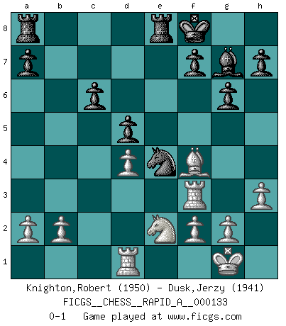 Last move : 0-1 2013 March 10 5:28:20 [Event "FICGS__CHESS__RAPID_A__000133"] [Site "FICGS"] [Date "2012.12.05"] [Round "1"] [White "Knighton,Robert"] [Black "Dusk,Jerzy"] [Result "0-1"] [WhiteElo "1950"] [BlackElo "1941"] 1.e4 c6 2.d4 d5 3.exd5 cxd5 4.c4 Nf6 5.Nc3 g6 6.Qb3 e6 7.Nf3 Nc6 8.cxd5 exd5 9.Bb5 Bg7 10.Qa3 Qe7+ 11.Qxe7+ Kxe7 12.O-O Be6 13.Re1 Rhc8 14.Bf4 Kf8 15.Rad1 Bg4 16.Re3 Rd8 17.Bxc6 bxc6 18.h3 Bxf3 19.Rxf3 Ne4 20.Ne2 Re8 0-1 This chess game has been lost on time (started : 2012.12.05 16:17:27) Caro-Kann : Panov-Botvinnik attack, 5...g6 Kingside Castling by player White (move 12) Player Black won this chess game. Follow this game move after move (download)He who fears an isolated Queen's Pawn should give up Chess. (Siegbert Tarrasch) Ohne ihre Erfolge schmälern zu wollen würde ich sagen Petrosian, Spassky und Karpov verdanken ihre Siege ihren Trainern - Boleslavsky, Bondarevsky und Furman. (Mikhail Moiseyevich Botvinik) Solo el jugador con la iniciativa tiene el derecho a atacar. (Wilhelm Steinitz) Des idées, des idées, j'en ai cent, j'en ai mille. Des bonnes, des mauvaises, applicables, irréalisables... Il suffit de faire le tri ! (Roos) Now the reason the enlightened prince and the wise general conquer the enemy whenever they move and their achievements surpass those of ordinary men is foreknowledge. (Sun Tzu)